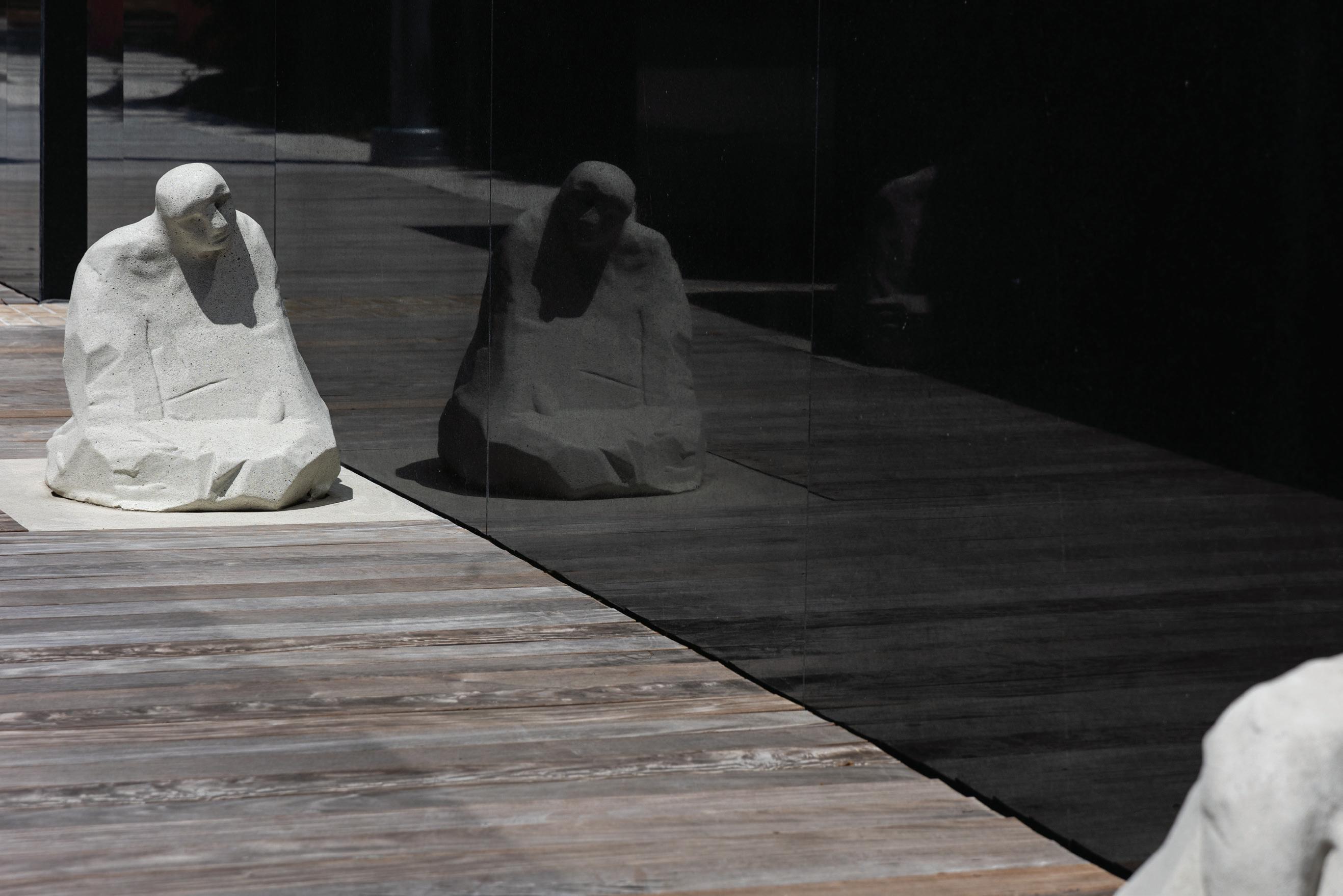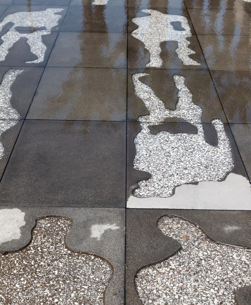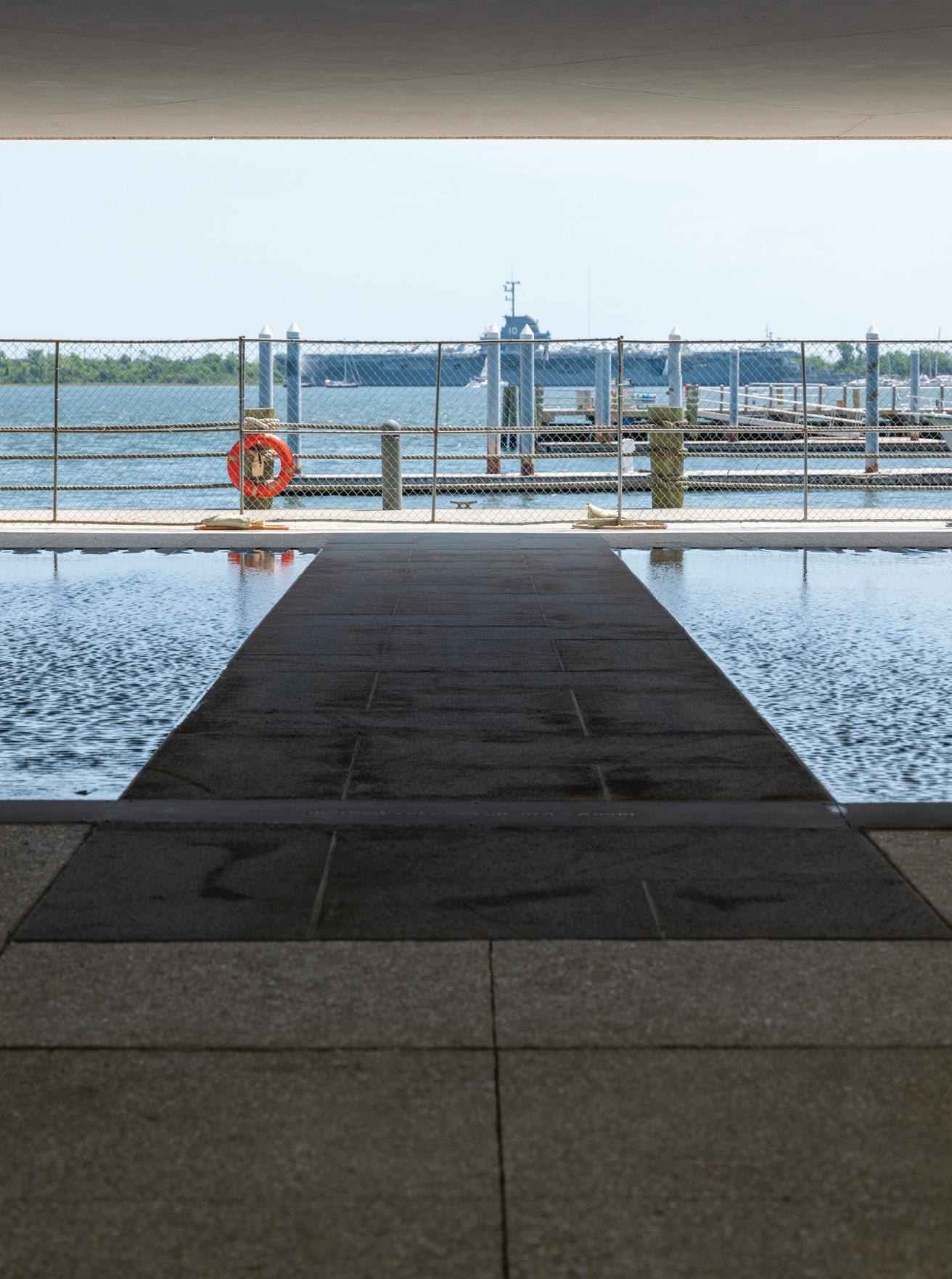 While visiting local historic sites to gain insight into the project, Hood saw a copy of the diagram from the slave ship Brookes on Sullivan’s Island—an image depicting how slave traders could barbarically cram 454 captured Africans into the vessel’s hold. The haunting image reminded him of an abstract African textile, and it sparked his idea to sculpt a similar design on the bottom of an infinity pool and fountain below the lofted building, marking the historic edge of the wharf. Water in the fountain drains and refills several times daily like the tide, ritualizing the sacred ground of the wharf and symbolically collapsing time, melding past and future, honoring African ancestors and the continuation of the diaspora through generations to come.