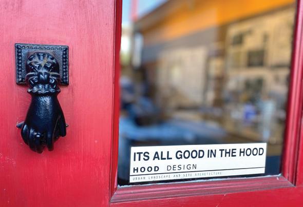 “ITS ALL GOOD IN THE HOOD” proclaims an old bumper sticker (in artful all caps, no apostrophe) in the bottom glass pane of Hood Design
