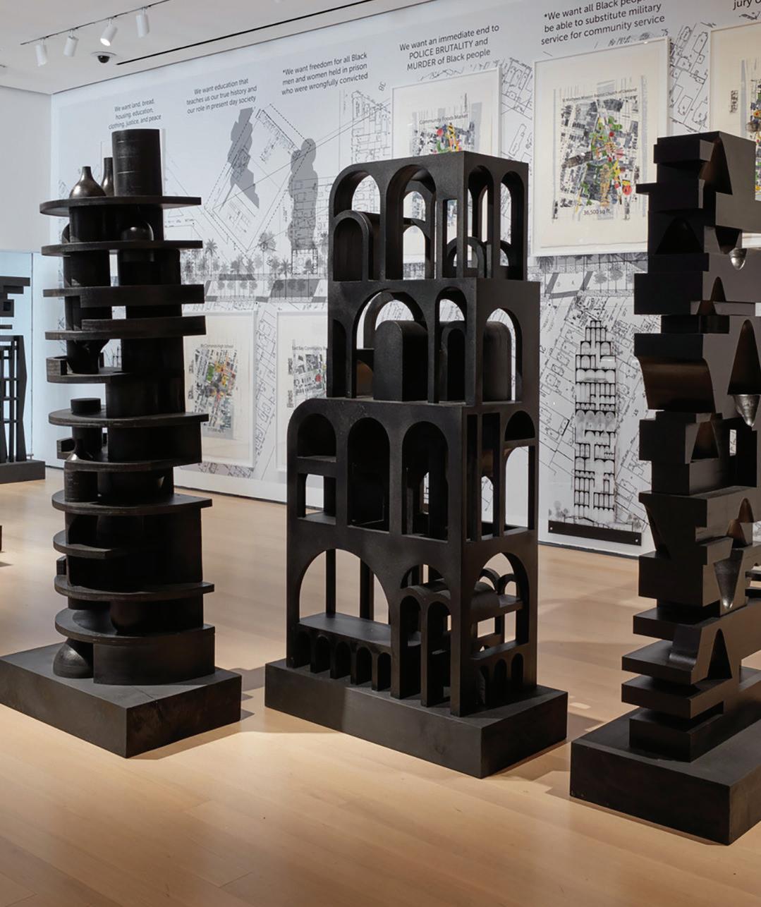 Hood cranked up the volume, for example, in his paradigm-shifting “Black Towers/Black Power” installation at MoMA in 2021, part of “Reconstructions: Architecture and Blackness in America,” the first-ever MoMA exhibit to feature Black architects. In it, Hood presented a series of ten rhythmic, sculptural high-rise towers along an urban California avenue, each tower inspired by a patent held by African American innovators (e.g. the folding chair and heating furnace). Together, they “reimagine(d) what a healthy, vibrant and safe neighborhood might look like for Black and Brown people,” Hood explained. His evocative ebony towers and the show in general was “mind-blowing, beautiful work,” according to The New York Times, with “radical goals,” including offering “necessary responses to a system of cultural exclusion that, time and again, erased, demeaned and denied Blackness.”