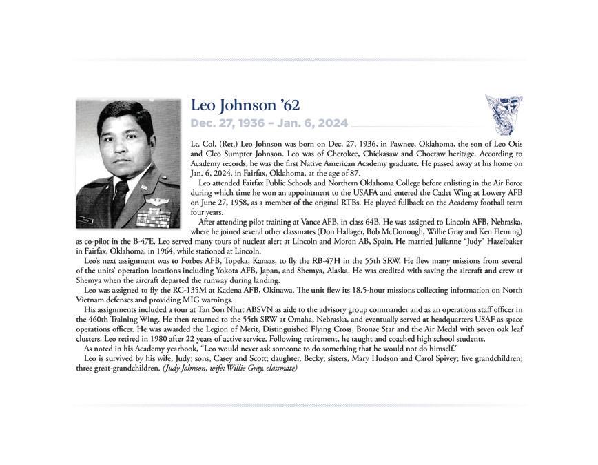 Here’s A Toast, like West Point’s TAPS, honors individuals by sharing their stories and preserving their legacy. A memorial article is one way of preserving the memories and important stories of those who committed themselves to a life of service for our Air Force, Space Force and nation. We thank the loved ones and classmates who contributed the memorial articles in the pages to follow.