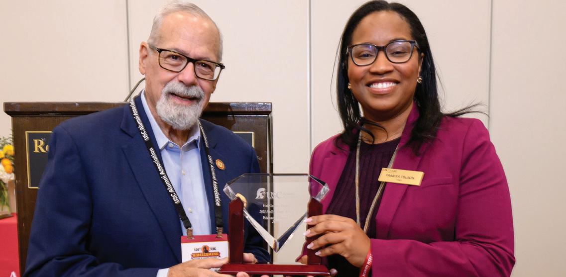 USC Gould School of Law Board of Councilors Member Richard Chernick (JD 1970) received the USC Alumni Association’s Half Century Trojans Hall of Fame Award during the 2023 Alumni and Reunion Weekend festivities in November. Chernick is vice president and managing director of JAMS’ arbitration practice and has served as a lecturer in law at USC Gould. USC’s Half Century Trojans are a community of USC alumni who earned a bachelor’s degree at least 50 years ago. The Hall of Fame honors the Half Century Trojans who exemplify the ideals of the Trojan Family and have had a significant impact in their field.