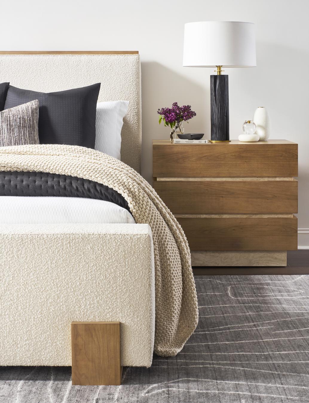 (W 83 D 100.5 H 52) Fabric: Nixon Cream. Finish: Camel. 5. Edge Stocked Nightstand P588N2CA. (W 28 D 18.5 H 29.5) Finish: Camel. Bleached Walnut Solids and Veneers, Three Drawers with Finger Pulls, Travertine Base and Accents. 6. Edge Stocked Nightstand P588N1-CA. (W 34 D 18.5 H 29.5) Finish: Camel. Bleached Walnut Solids and Veneers, Three Drawers with Finger Pulls, Travertine Base and Accents.