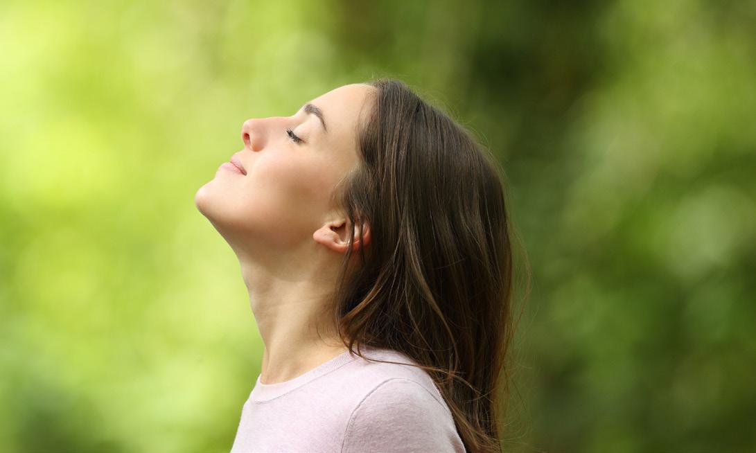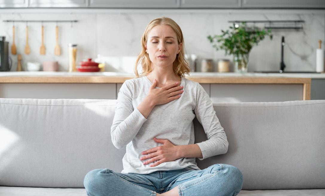 Inhale: Sit or stand and place your hands firmly and comfortably on your stomach. Inhale slowly and deeply through your nose, letting your stomach expand as much as possible.