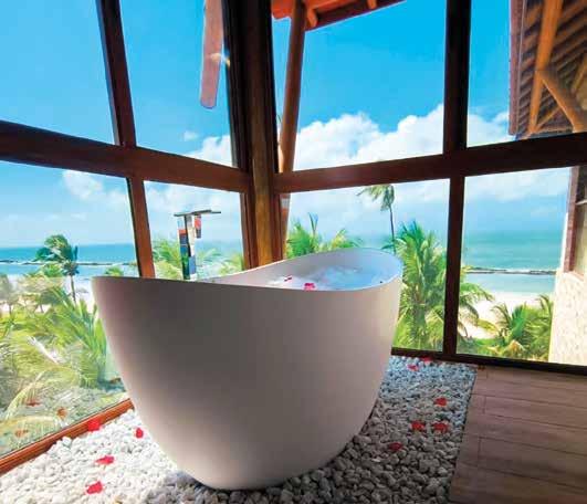 na areia, como a Samba Pa Ti, na paradisíaca praia do Patacho, repleta de piscinas naturais na maré baixa. São 15 bangalôs e um estúdio, incluindo uma unidade adaptada por pessoas com deficiência. Ali, o hóspede encontra serviços personali-