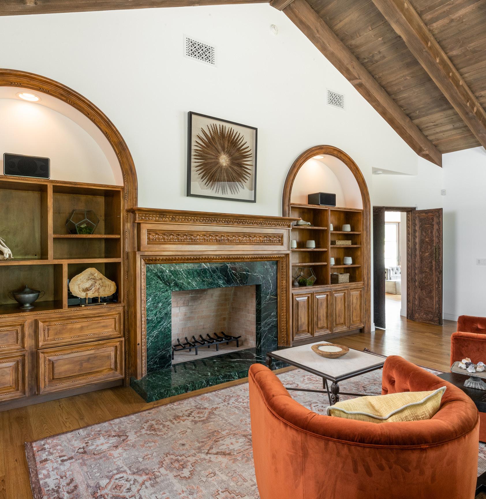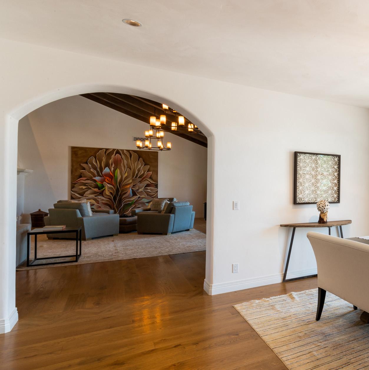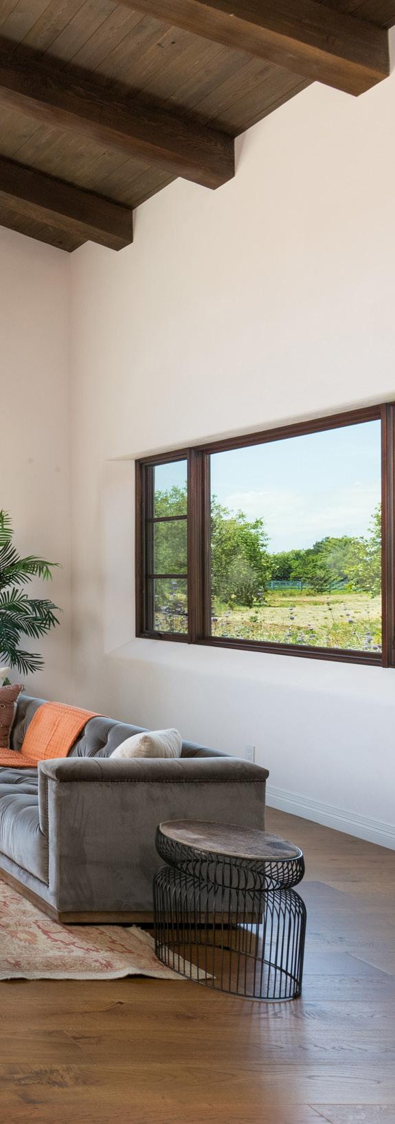 The expansive great room with vaulted beamed ceilings is anchored by a fireplace and 2 nearly fulllength windows let in refreshing natural light. A fulllength custom Nana wall accordion door leads out to covered patios on the east side of the home. The Nana wall allows the entire east side of the room to be completely open when the weather is right or for indoor-outdoor parties. A modern Lutron Light system powers lights and can be controlled by a cell phone. Iron light fixtures throughout the home and exterior were custom designed and handmade by a Santa Barbara artisan.
