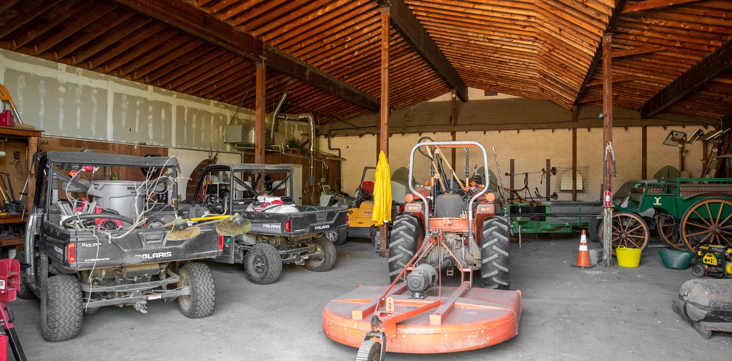 • East Barn - 4500 +/- SF storage barn with storage, polished and sealed concrete floors, and wood beamed ceilings. 2 roll up doors. Can easily be modified back to horse stalls or to car collection storage and more.