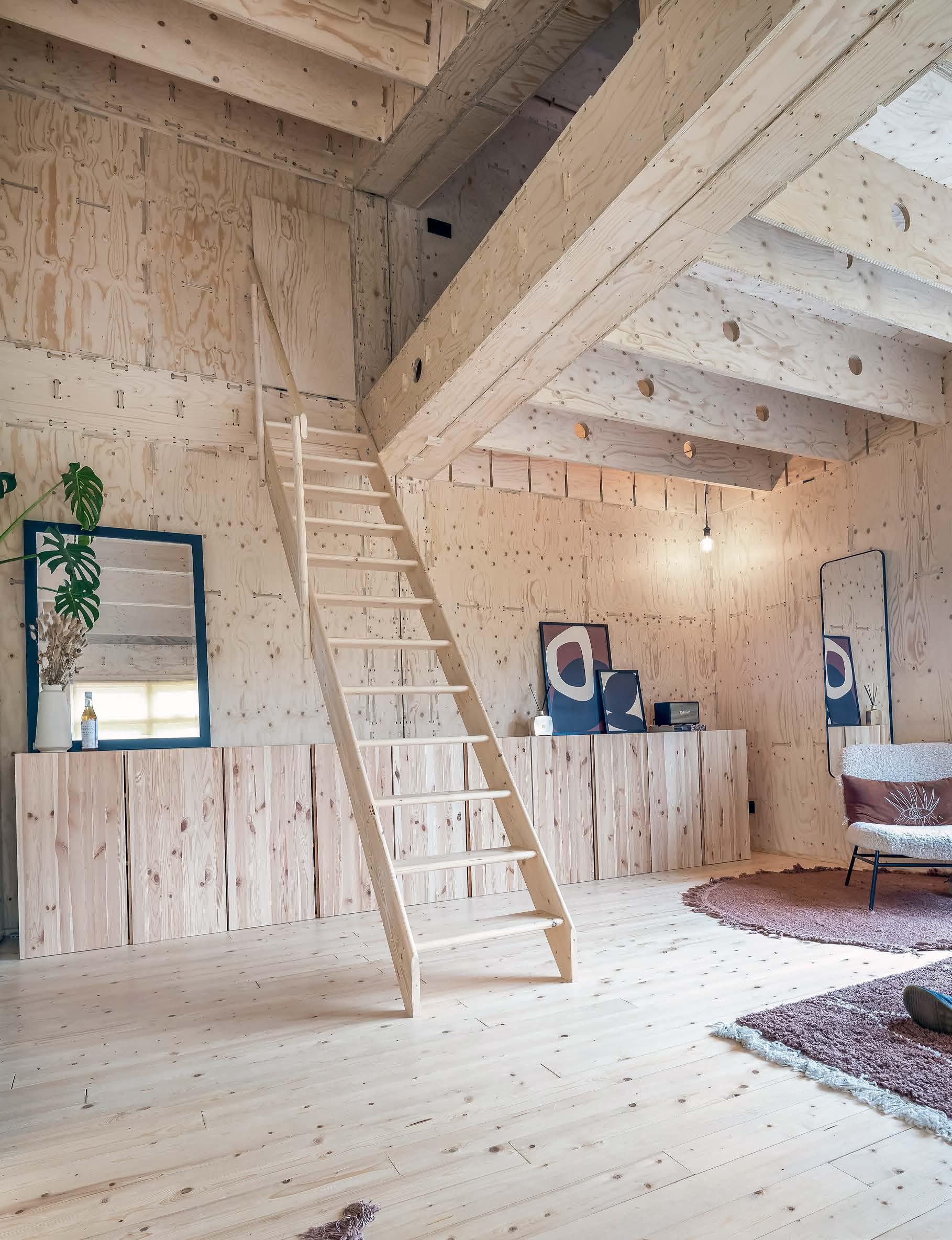 De trap naar de slaapkamer staat midden in de woonkamer. “Dat kwam zo handig uit in het ontwerp, en het ziet er speels uit. Als vrienden komen, fungeert de trap vaak als