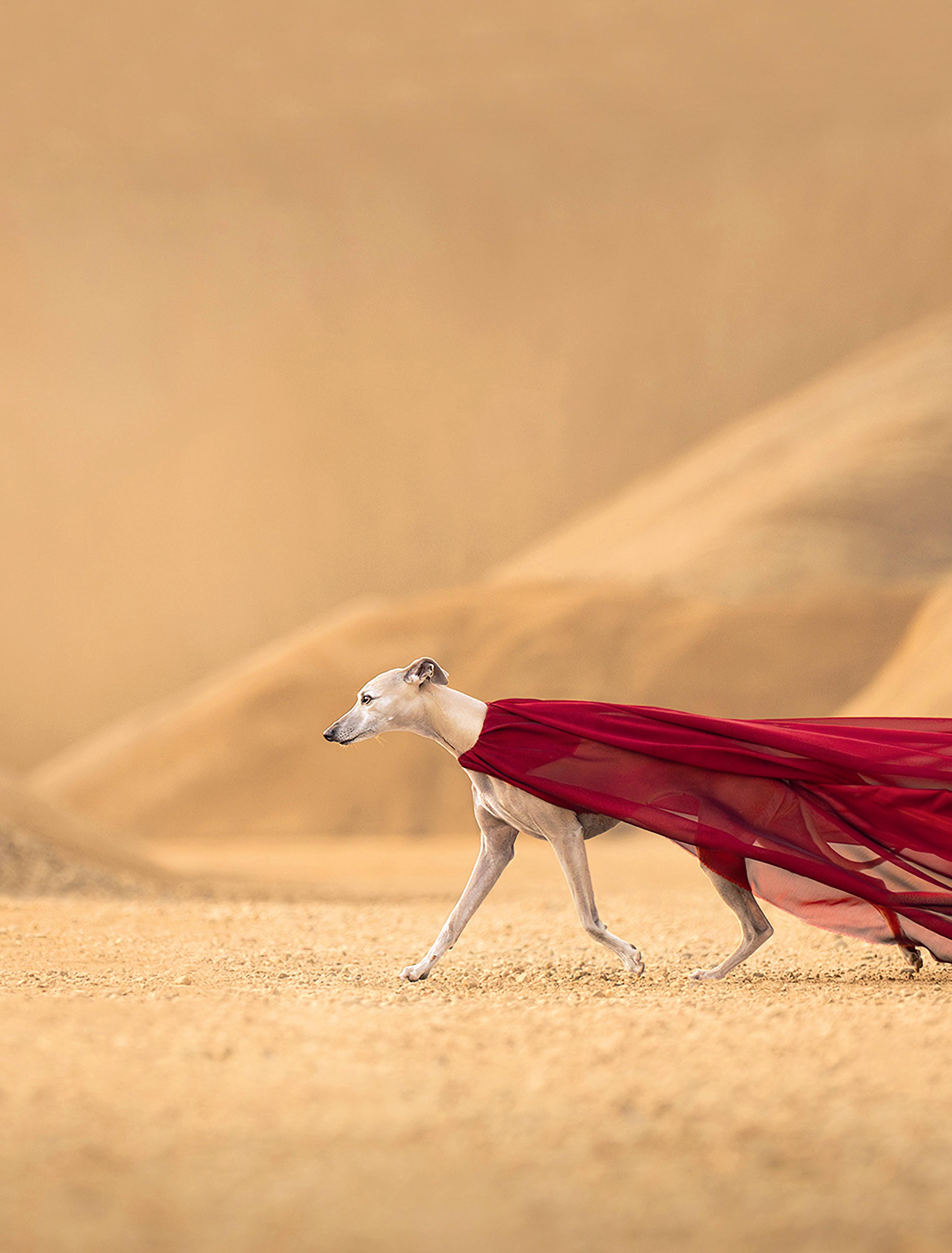 Deze betoverende foto van Regine Jensen uit Noorwegen won de eerste prijs in de categorie ‘Actie’ bij de Dog Photography Awards 2024. Het beeld draagt de titel ‘Moving in time’ en toont de elegante Whippethond Rebelle, die met een majestueuze uitstraling door een vermeende Sahara wandelt. Wat de meeste mensen echter niet weten, is dat dit woestijnlandschap in werkelijkheid een bouwterrein in Noorwegen is, dat Jensen met slimme fotografische technieken omtoverde tot een adembenemend decor. Whippets zijn van nature al gracieuze honden. Hun geschiedenis gaat terug tot de middeleeuwen. In Noord-Engeland werden ze al in de 16e eeuw genoemd. De naam Whippet betekent letterlijk ‘snel rennende kleine hond’. Dit ras werd oorspronkelijk gebruikt voor de jacht op konijnen en het jachtinstinct zit nog steeds diep in hun natuur. Dit moet dan ook goed worden meegenomen in hun opvoeding en verzorging. Ondanks hun jachtinstincten behoren Whippets tot de populairste en meest geliefde windhondenrassen in Europa. Meer van de prachtige werken van Regine Jensen vind je op haar Instagrampagina: instagram.com/defixphoenix.
