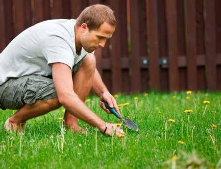 Verwijder paarden- bloemen liefst met penwortel en al.