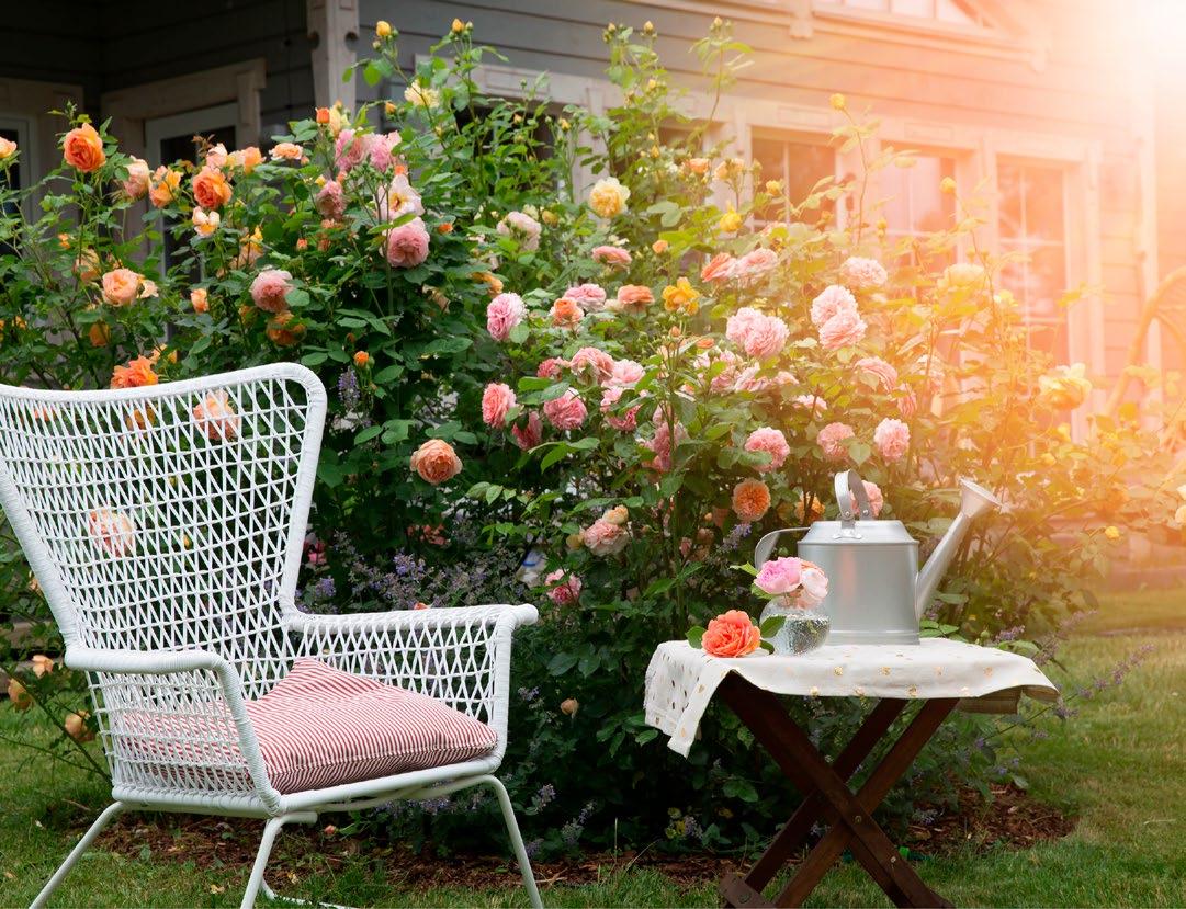 die slingerpaadjes, zegt Giny. “Dat heeft ermee te maken dat echt elk stuk grond benut moest worden voor de planten.” Een paadje in een cottagetuin voegt zich naar de ligging van de planten, en niet omgekeerd. De planten zijn de hoofdrolspelers en nemen alle ruimte in. Een uitgestrekt gazon zul je er dan ook niet snel vinden. Hetzelfde geldt voor een ding als een grijze loungeset van kunststof. De tuinmeubels in cottage gardens zijn bescheiden en van natuurlijke materialen: riet, hout of ijzer. Je zit erop om een beetje te mijmeren of thee te drinken met een etagère vol scones en sandwiches. Terrasjes in de tuin zijn gemaakt van cobblestones of van mooie klinkers. Paadjes zijn gemaakt van houtsnippers of in het gras liggende flagstones.