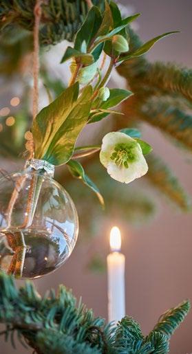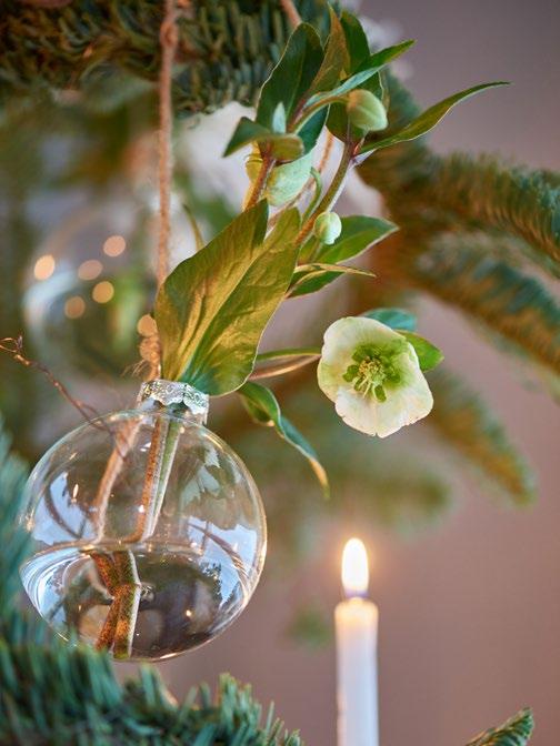 2 KERSTBALLENVAAS Doorzichtige kerstballen transformeer je in een handomdraai naar deze leuke vaasjes. Een bodempje water erin en je favoriete bloemen - hier Helleborus - kunnen zo de kerstboom in. Beeld: Plants & Flowers Foundation Holland