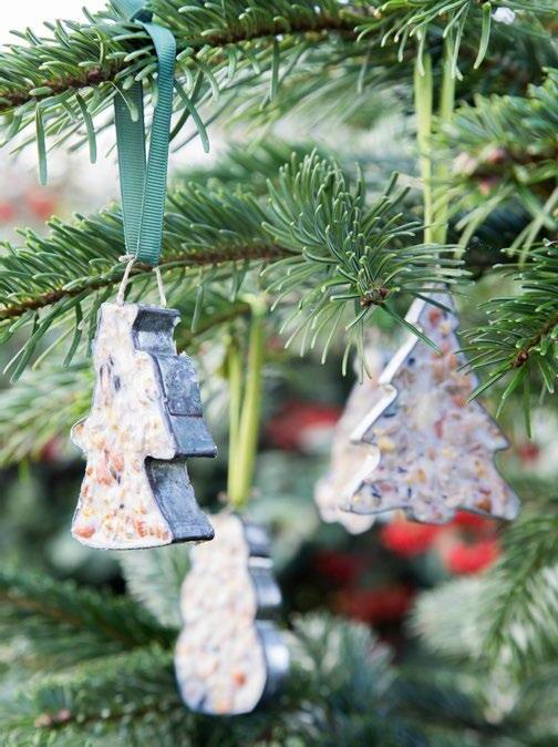 4 KERST VOOR DE VOGELS Meng wat vogelzaad met gesmolten ossewit en druk het mengsel stevig in uitsteekvormpjes. Laat uitharden en hang ze met een touwtje in de (kerst)boom buiten. Laat de steekvormen gerust zitten voor een shiny effect. Beeld: GAP Photos/Nova Photo Graphik