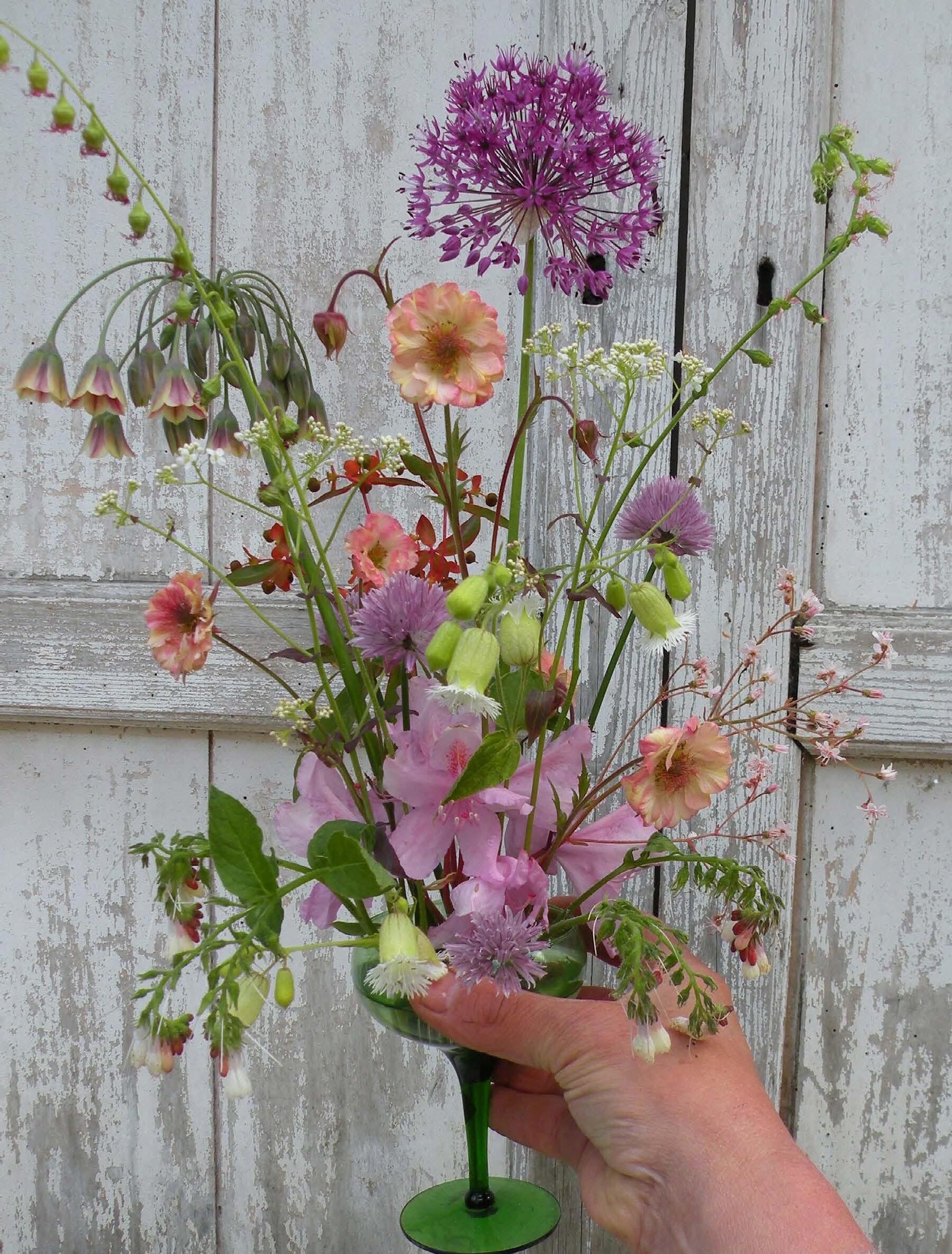 Leg de zware prikker in het glas, hierdoor kan het niet makkelijk verschuiven. Vul het glas met water. Zet met de grootste vormen en de dikste stelen een ovaalvorm op. Zet de stelen op of tussen de prikkers. Eindig met de dunne stelen van de fijnste bloemen, die zijn lastig te verwerken. Als je ze niet tussen de prikkers kunt plaatsen, klem ze dan tussen de grootste stelen en een prikker. Laat de kleine vormen boven het boeket uitsteken.