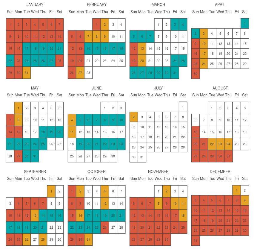 The calendar does not depict effects of all holidays, but they are always taken into account when booking groups. Only very large groups are blocked off on the calendar which represent dates for which we can no longer book further group business - we have booked business for dates elsewhere, but will continue to try to fill those dates.