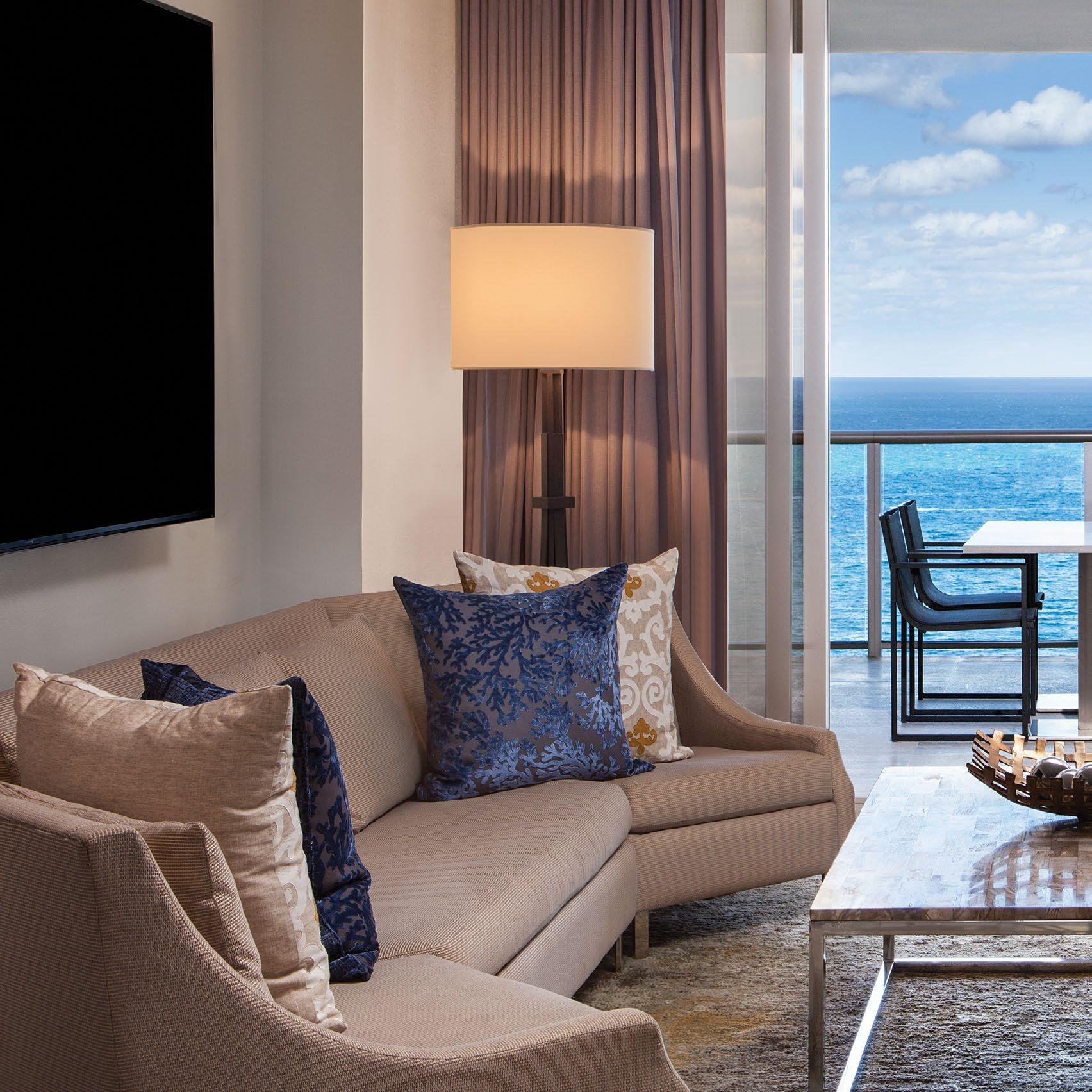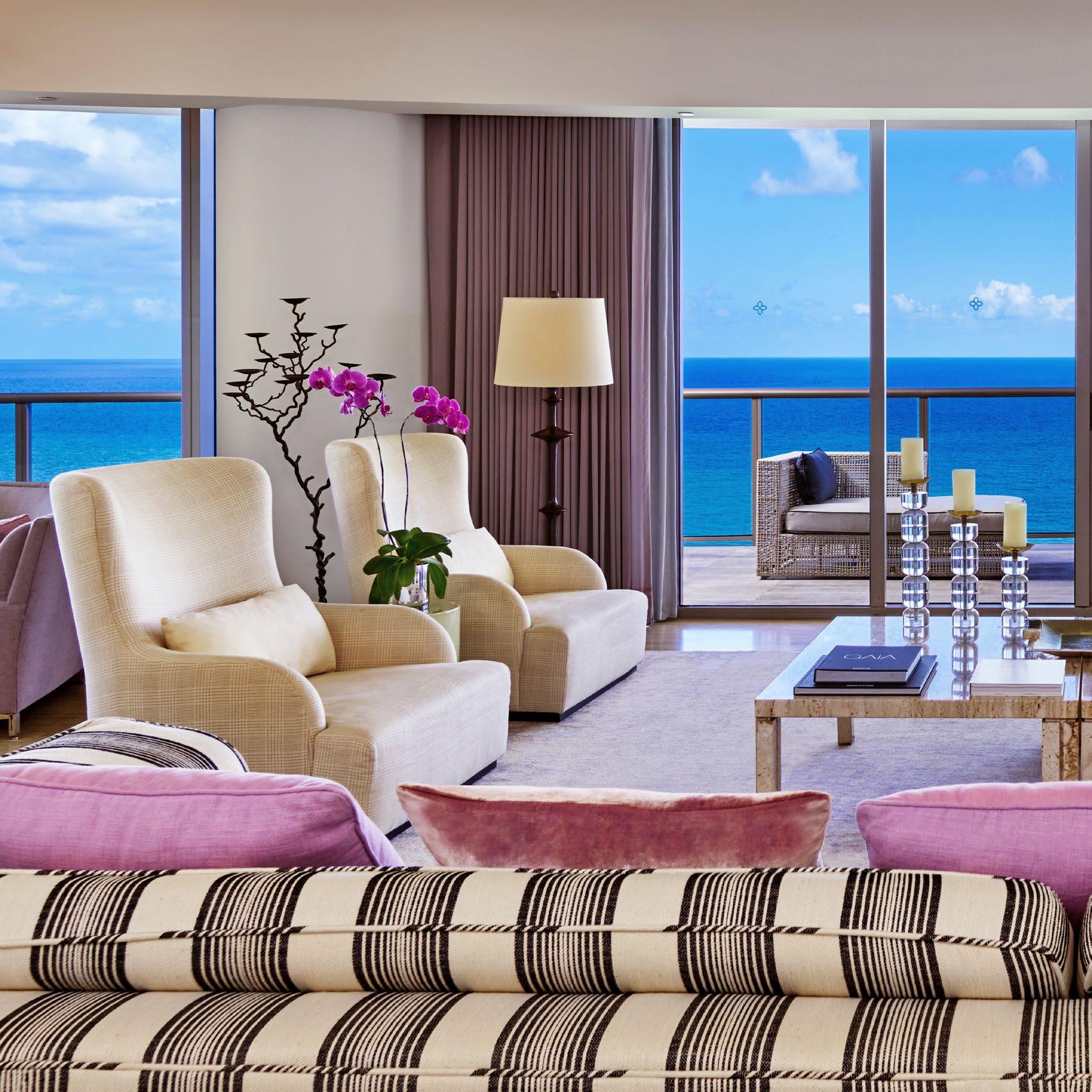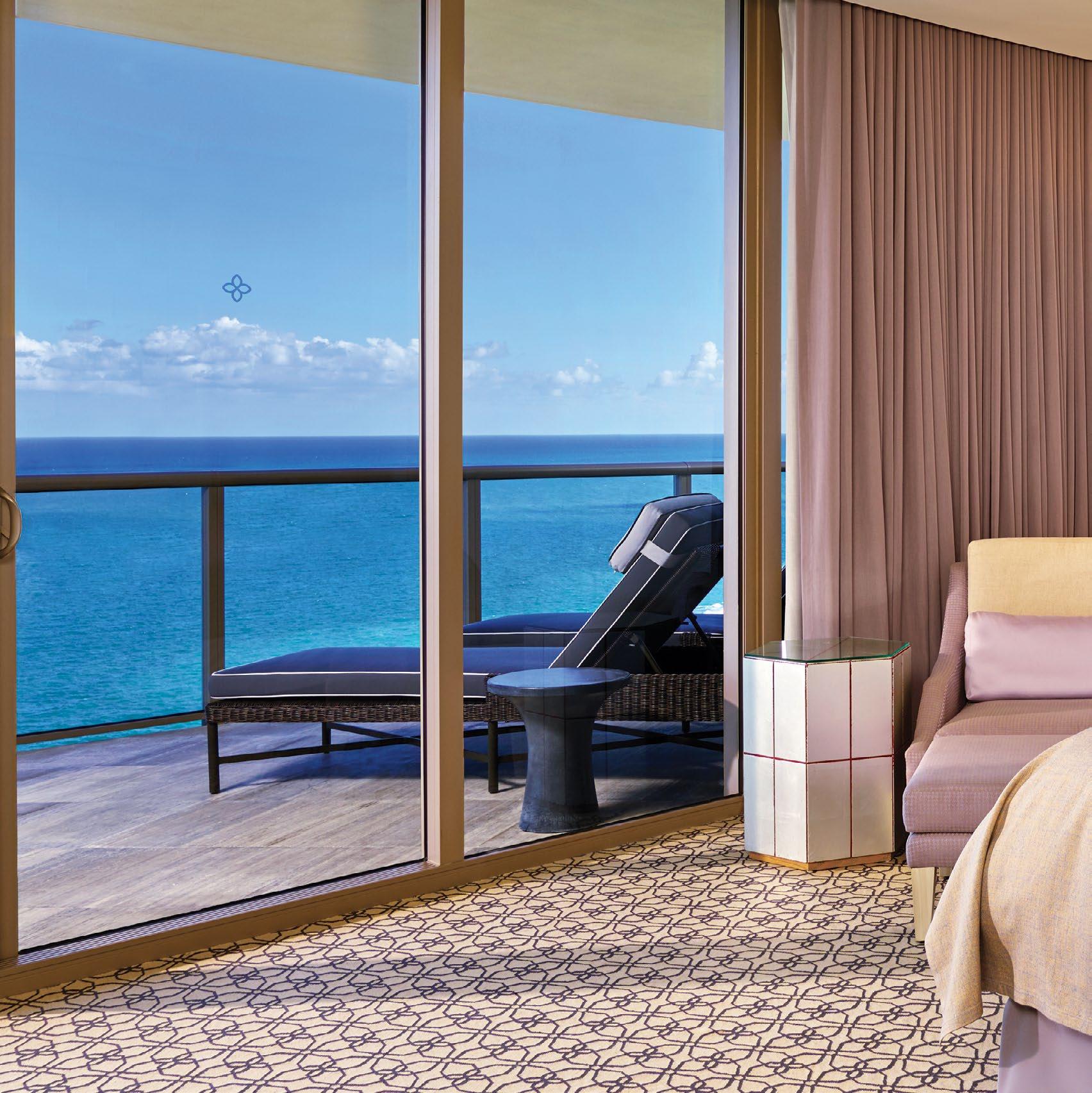 The St. Regis Bal Harbour features a total of 213 elegantly appointed guest accommodations starting at 650 sq ft to a 2,950sq ft four-bedroom Palace Suite. Enjoy spacious glass-enclosed balconies with floor- to-ceiling panoramic views of the ocean and white sand beach. Soft, refined color palettes and textures are accented with contemporary artwork, while modern conveniences and technology are incorporated seamlessly into their design.
