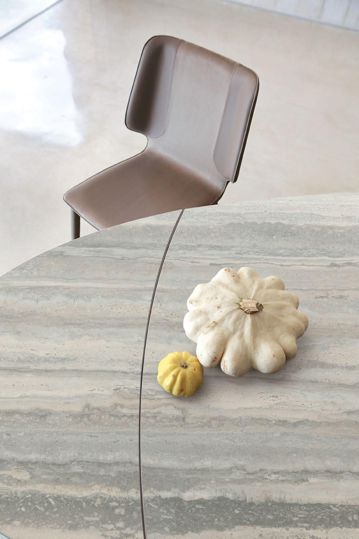 Alliage. Dining table, designed by Andrea Casati. Kasuka. Chairs, designed by Maurizio Manzoni. Dorienne. Suspension and table lamp, designed by Martino Sasso. Dune. Rug, designed by Emmanuel Gallina.