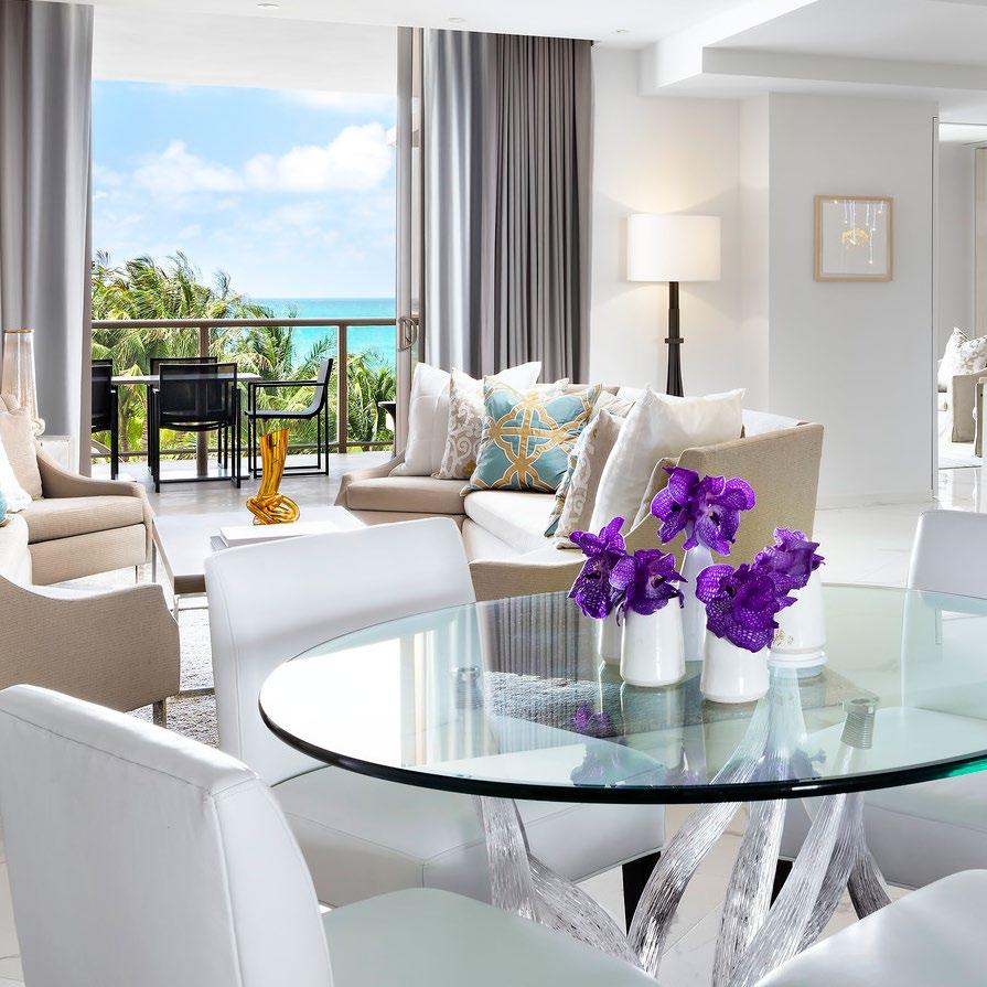 Take luxury to new heights in one of the resort’s Signature Suites, the Palace Suite. With a choice of Ocean or Sky Palace Suites this spacious accommodations feature two king bedded master bedrooms, each with an ensuite private five-fixture marble bathroom, walk-in closet, and spacious balconies. Two interior bedrooms boast queen beds perfect for friends or children. The main living room is ideal for lounging and opens to a kitchen with a glass dining table that seats eight.