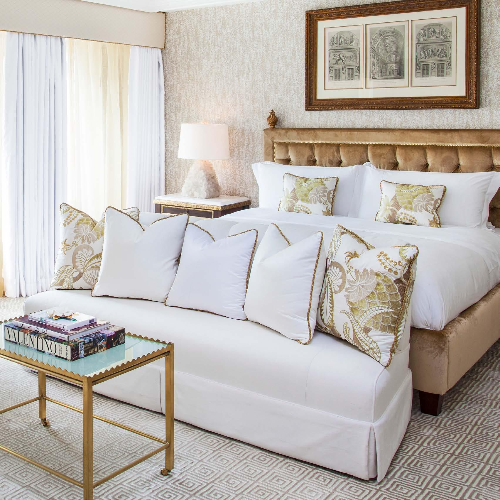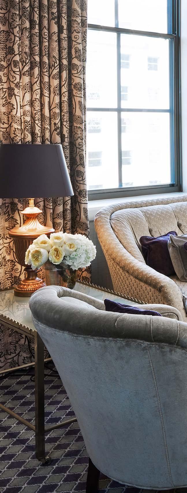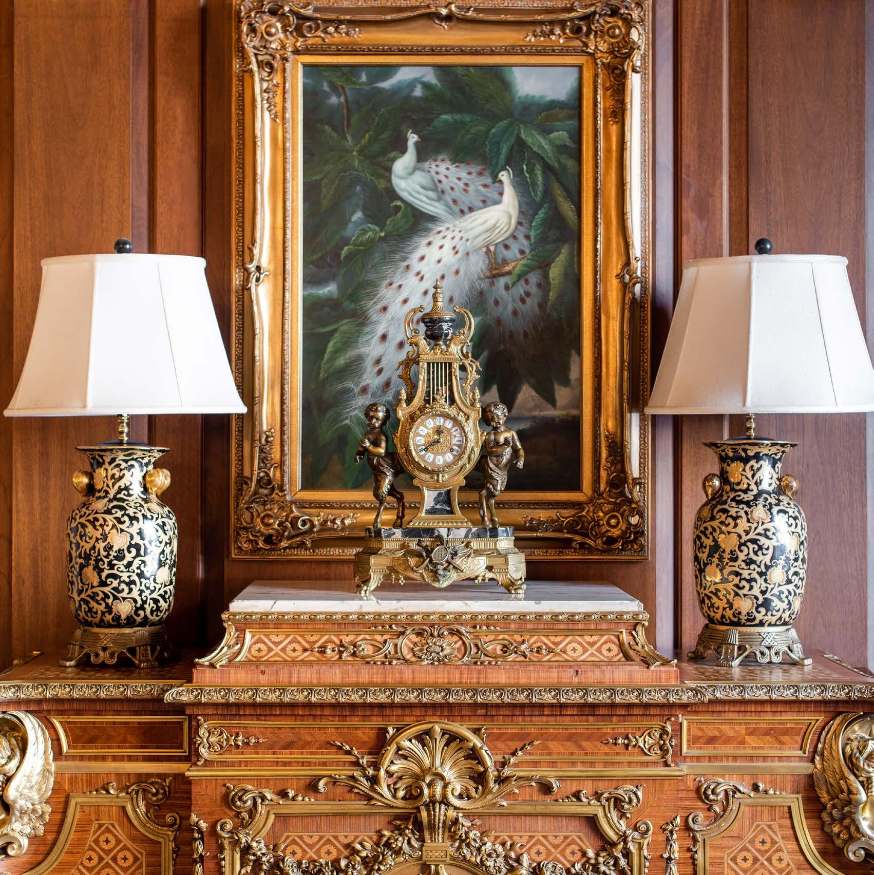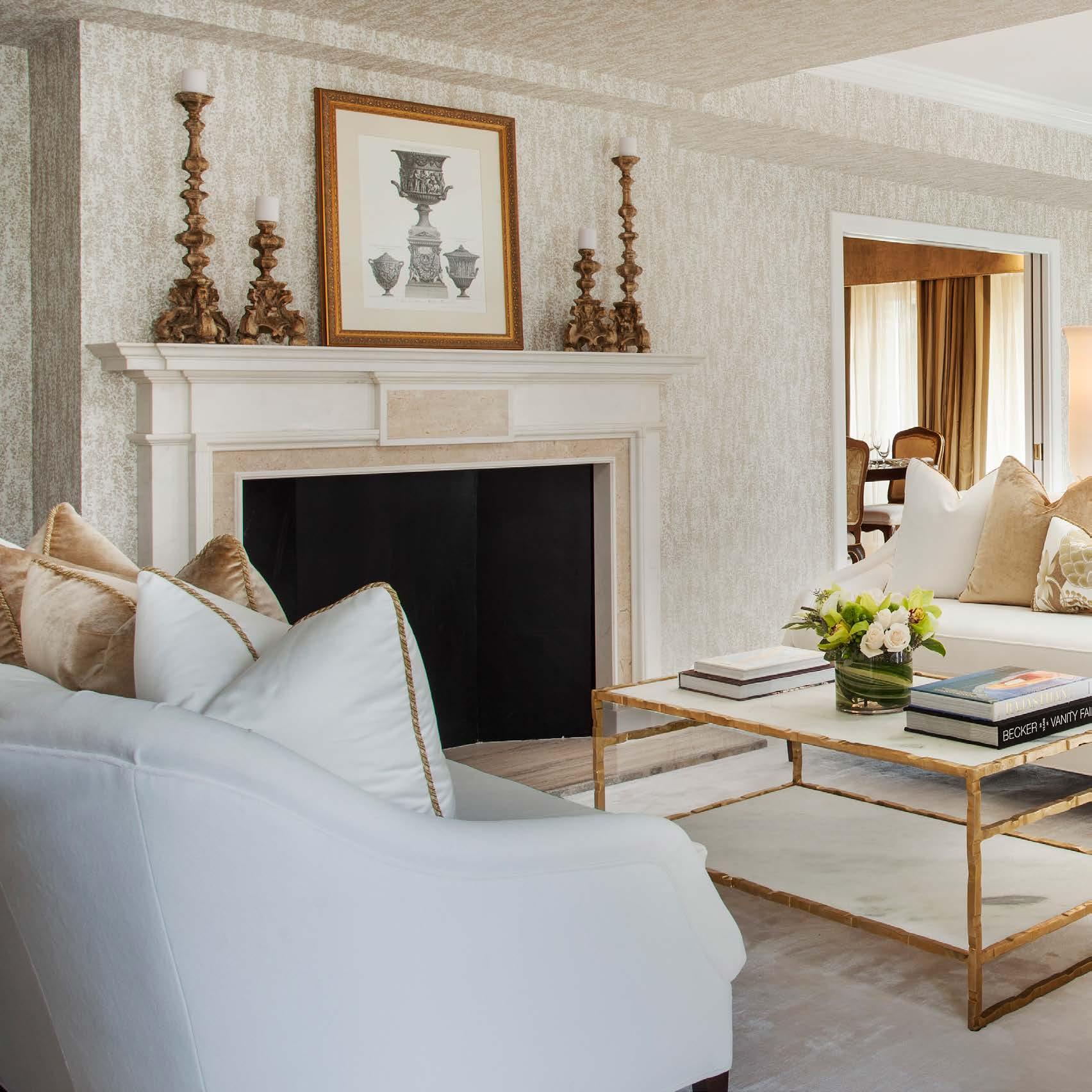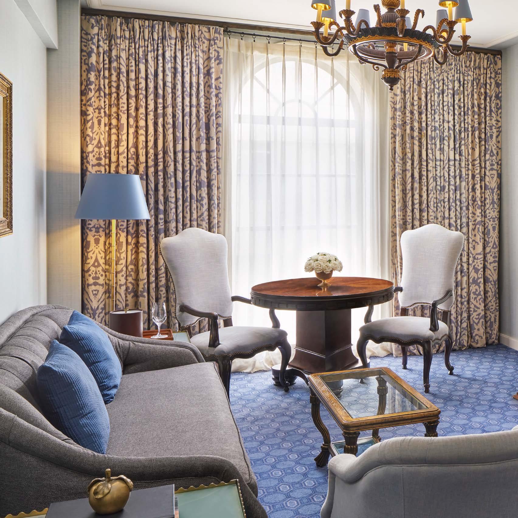 The 2,510 square foot Presidential Suite is the hotel’s largest and most lavishly appointed suite. Single doors lead to the expansive space, where walls are upholstered with handmade Italian beading. Cornices throughout are trimmed with handmade French trims and tassels, which are complemented by ornate tiebacks and antique marble windowsills. Artwork blends antique prints and original pieces, alongside European botanicals and carved French mirrors. Living room walls are covered in custom Nobilis wallpaper, which extends to a ceiling beam overhead. Positioned over a stark white area rug, a grand Spanish carved-wood table is topped with white marble. In the corner awaits an aged game table with an oversized chess set and four gold leaf-accented chairs. The adjoining private dining room can comfortably seat up to ten. Nearby, a butler’s pantry is designed to allow guests to entertain as formally as they wish, with as much convenience as a private home. The master bedroom has an adjoining library that provides a refined setting for more intimate gatherings. A large classically styled desk ensures ample space for work. Wireless High Speed Internet Access is available in each of the suite’s rooms, which also house 65-inch curved smart TVs and state-of-the-art audio equipment. The king bed is dressed with Frette linens, the highest-quality down comforters and plush, thick pillows and nearby are separate bathrooms.