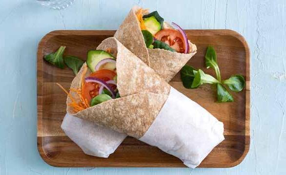 4. Rol de wraps op en snijd eventueel schuin doormidden.