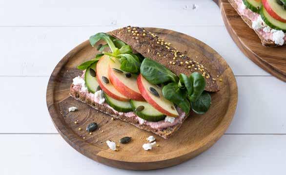 1. Snijd de volkorenbroodjes open en besmeer ze met halvarine en 1 eetlepel bietenhummus per broodje.
