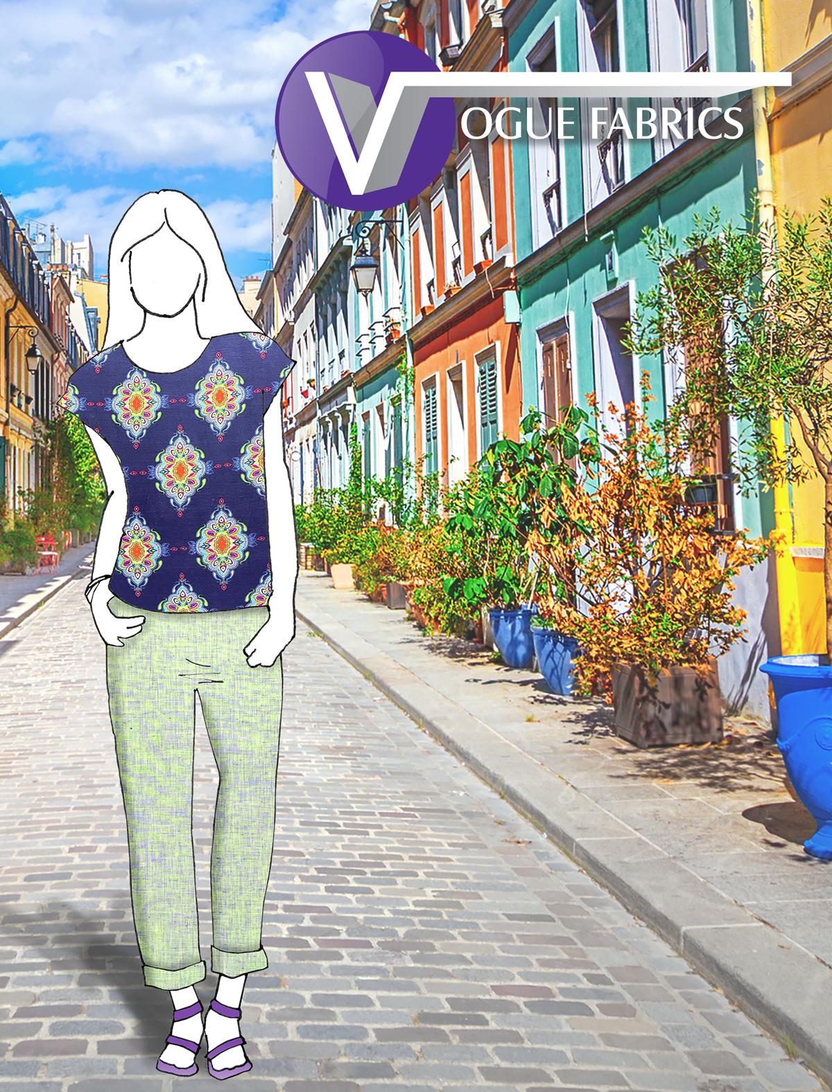 You don’t need to be on the set of Emily in Paris to dress with flare and penache. This first collection is built around three exciting textiles we picked up from Chicago fashion designer Andria Lieu. Imagine yourself going out in a tunic length tank top whipped up from Paris Marina, topped by a bell-sleeve tie-front 3/4 length sweater you’ve masterfully crafted from Andria’s Paris Coupe , and Capris sewn from Paris Bark. The color coordination between the marina and bark enhance the distressed designer knit perfectly. Use excess of the marina to bind the edges of the distressed knit if you don’t want to make a facing. The brown stretch poplin of Paris Bark will fit the bill for slacks, a jacket, and a matching bag that you can embroider.