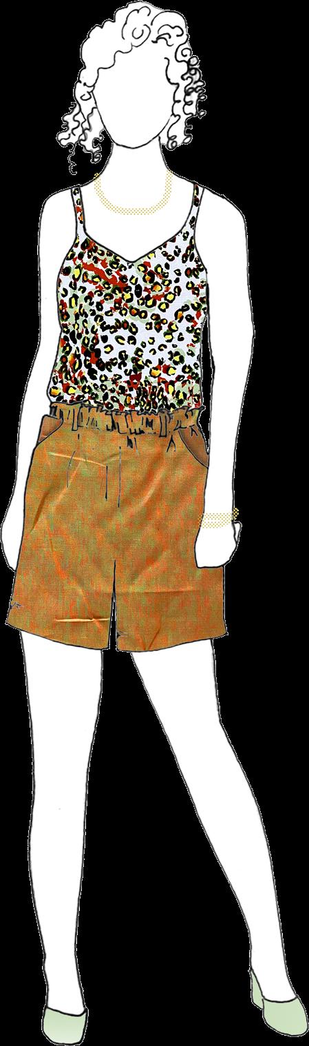 This bright collection begins with Lumière Paisley (page 25), a dynamic printed cotton from Robert Kaufman’s fashion division. Choose this whenever a light to medium weight woven with body is called for. You can pair it with the following pink knit or the upcoming yellow linen blend, depending which direction you want to go with your color scheme. Lumière Cerise is extra-wide at 70”! Plus, it is quite a substantial cotton knit. Order enough for leggings, and you should be able to cut out a tank top or bandeau as well. The pink blends beautifully with all the prints in this collection.