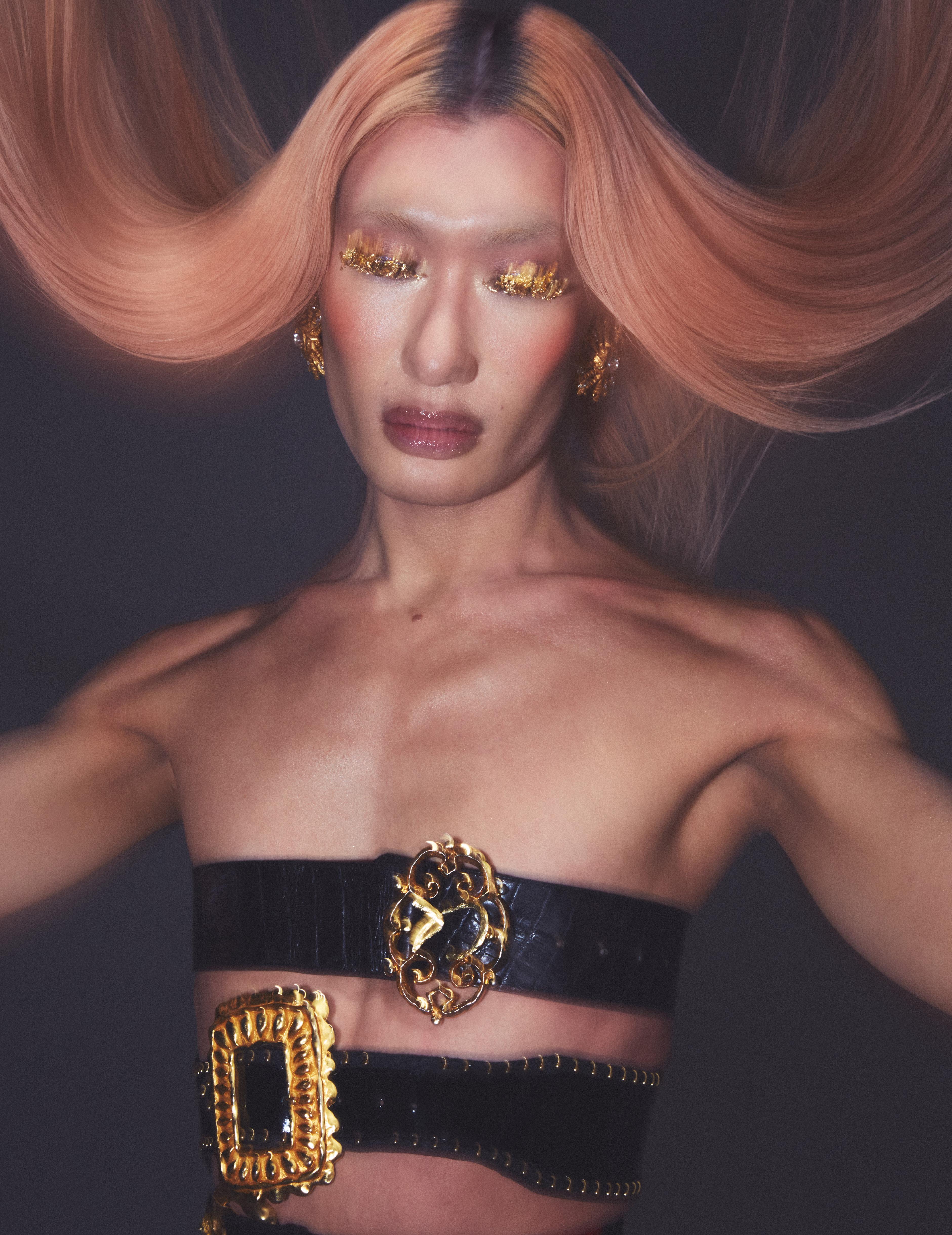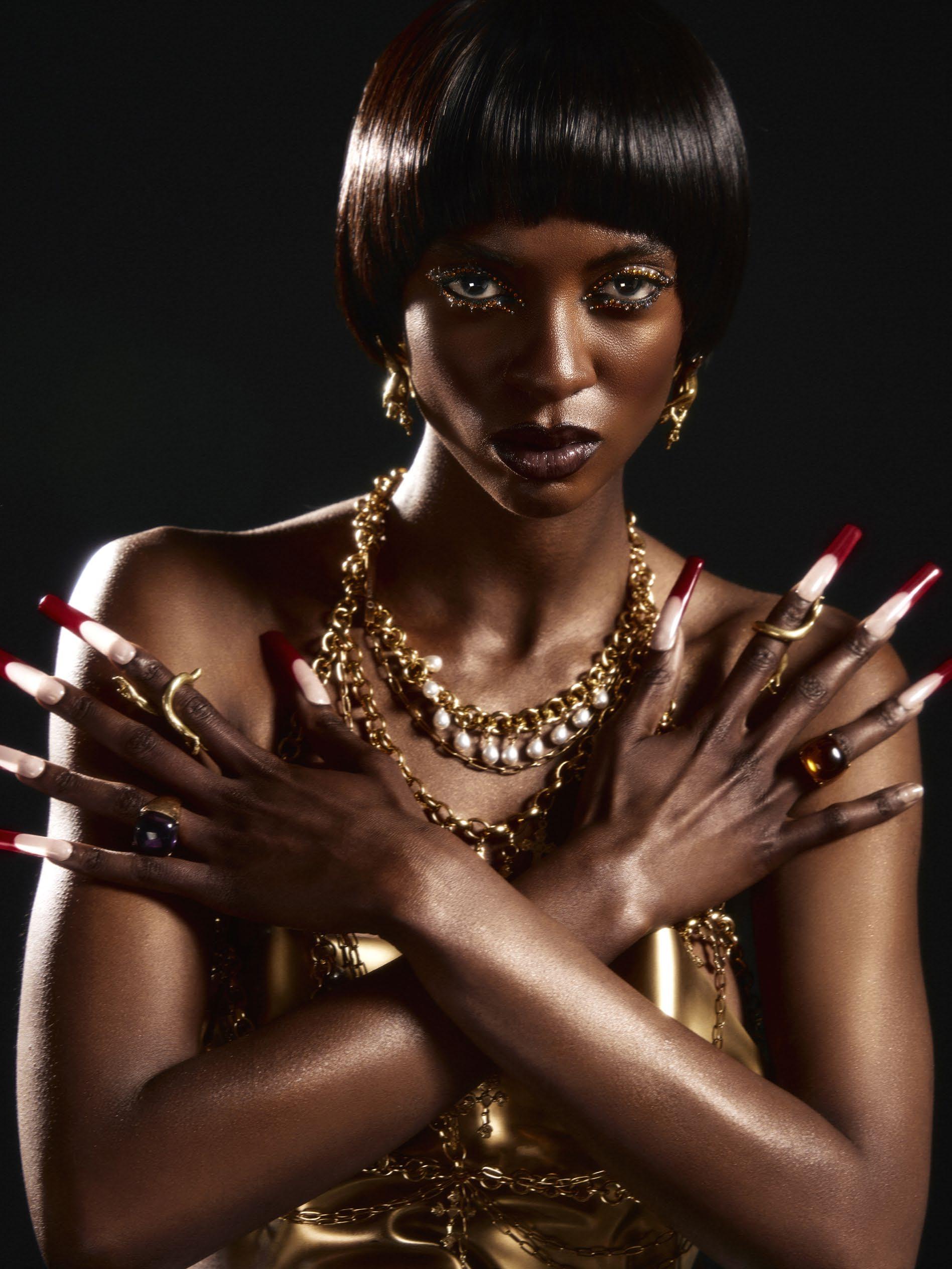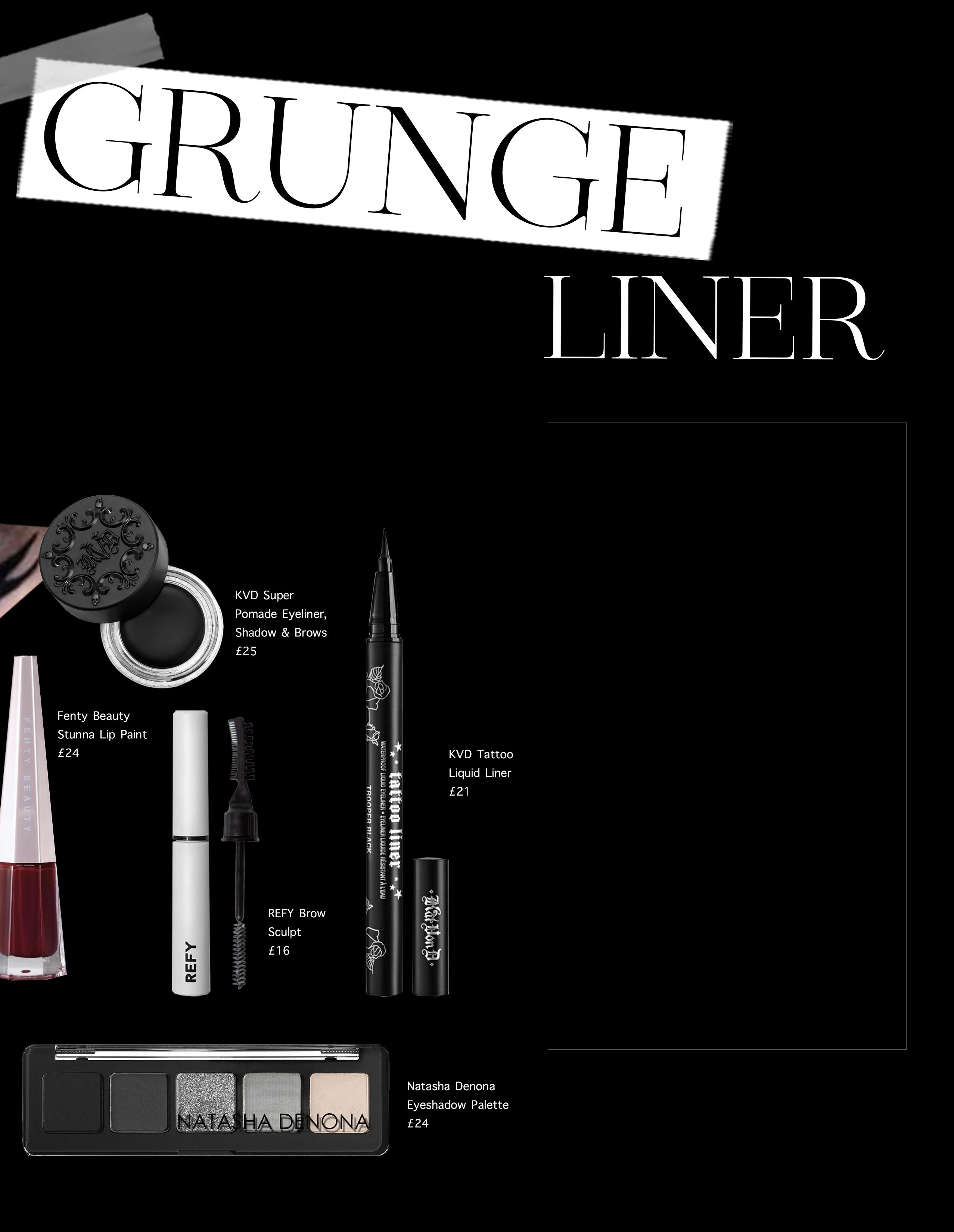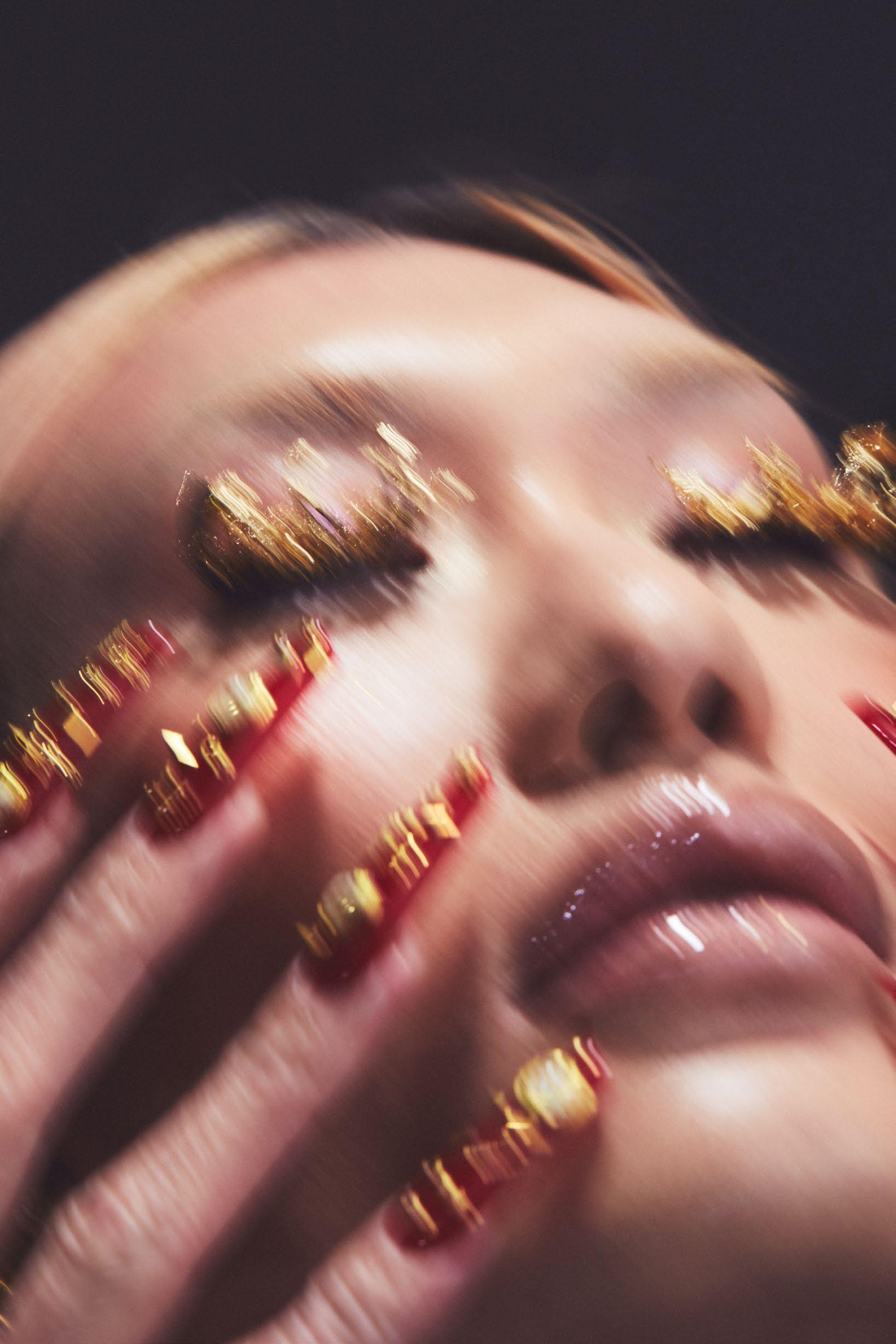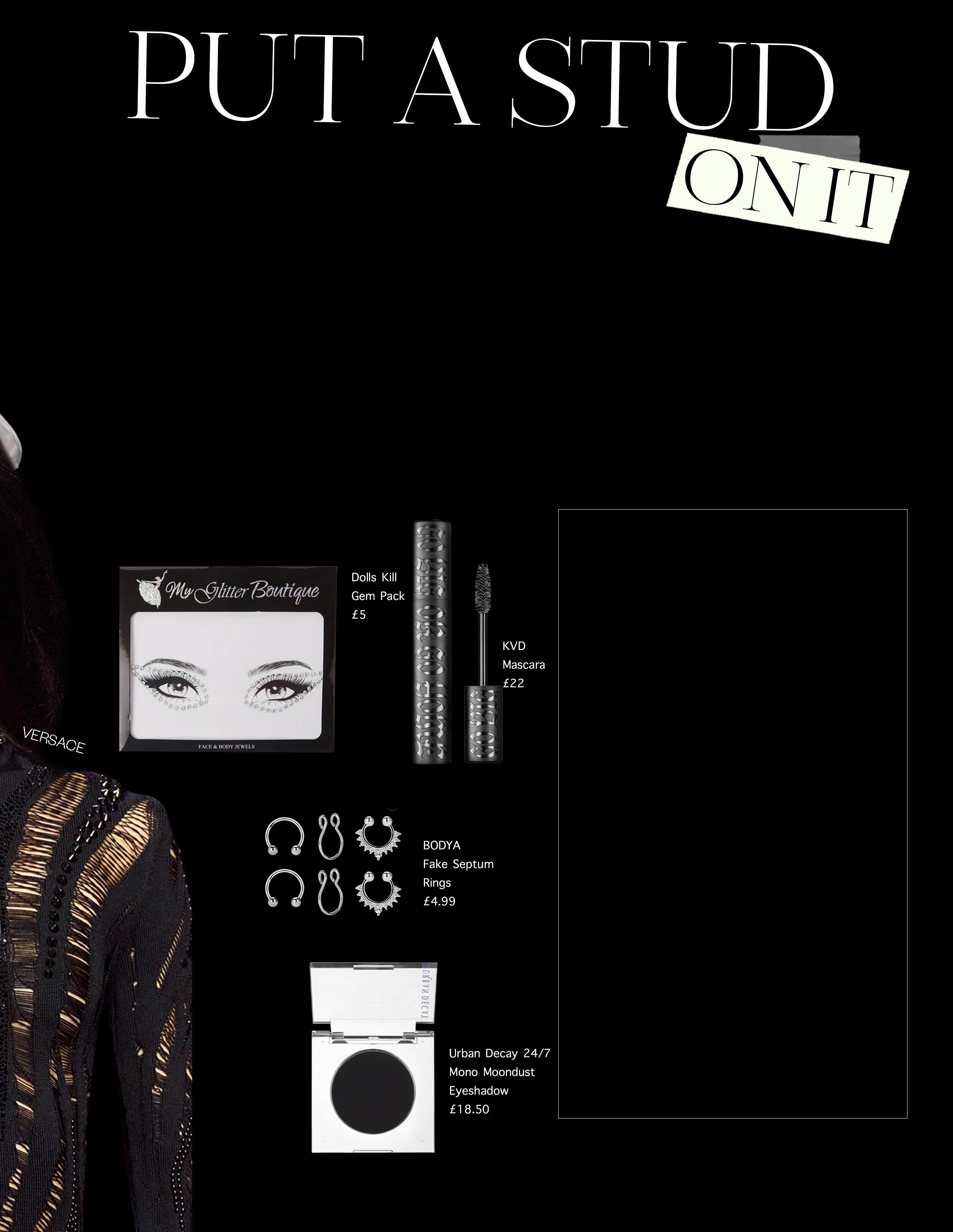 Peptides, £43, Mutiny Lip Balm, £17.85. KVD Beauty , Good Apple foundation, £34. NARS Radiant Creamy Concealer, £21.25. Pat McGrath Blurring Under-Eye Powder, £28. Make Up Forever Artist Colour Pencil, £16.50. Pat McGrath Lust Gloss, £28. Inglot Pure Pigment Eyeshadow, £14. MAC Gold Glitter, £18.50. PLT Gold Face Foil Flakes, £5. KVD Beauty Tattoo Liner, £19. Elorda Faux Minx Lashes, £6.73. Vintage Christian Lacroix belts, Vintage Escada . belts, Haute Couture Christian Lacroix bracelet and earrings, all available at 4 Element .