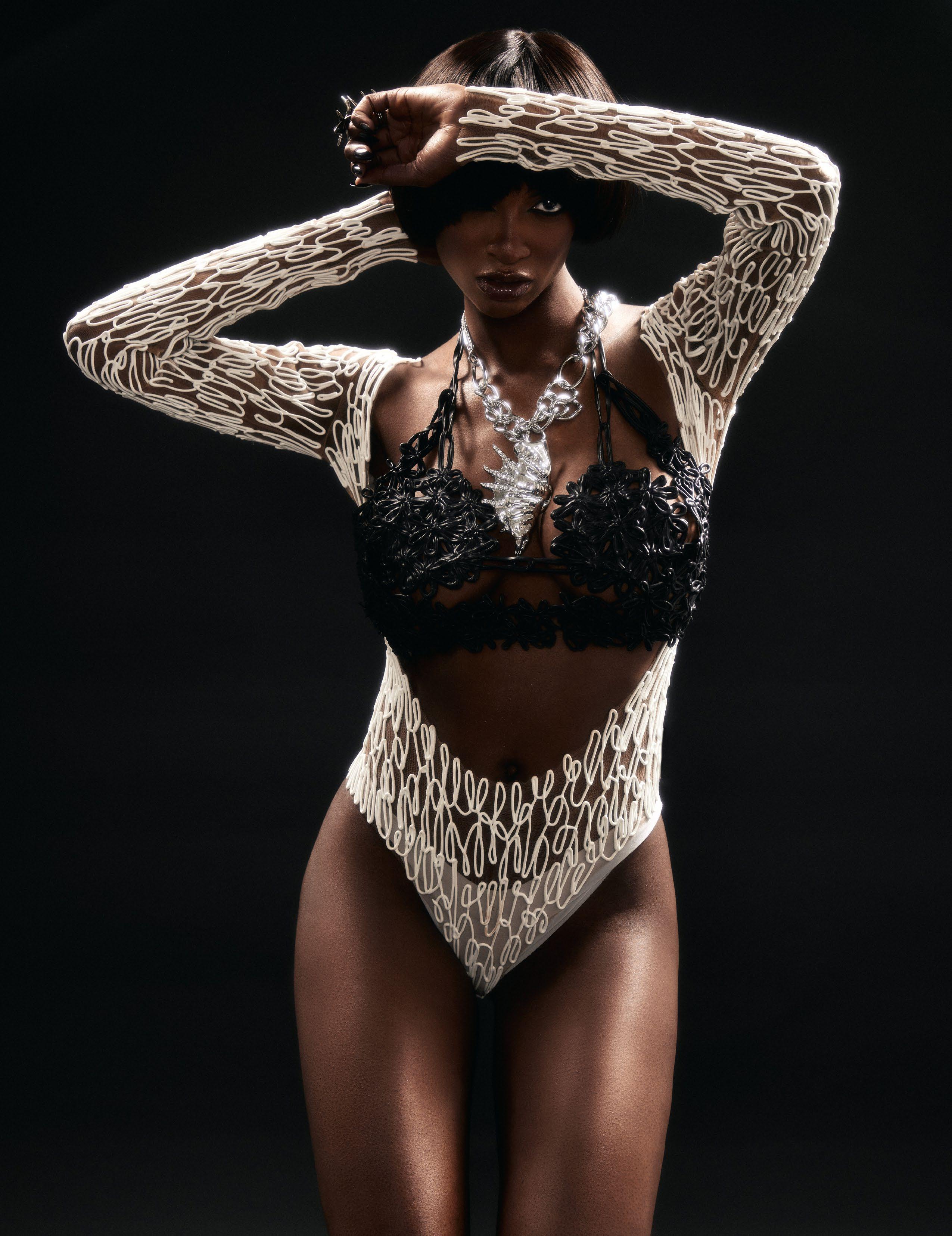28 Kasia Kucharska Long Bra Black £230, Panties Black £90, Body White £360. Costume Therapy Centipede Ring £73. Silver Shell Necklace £40, Spiral Heels with Block He el £15 Available at H&M Rental.