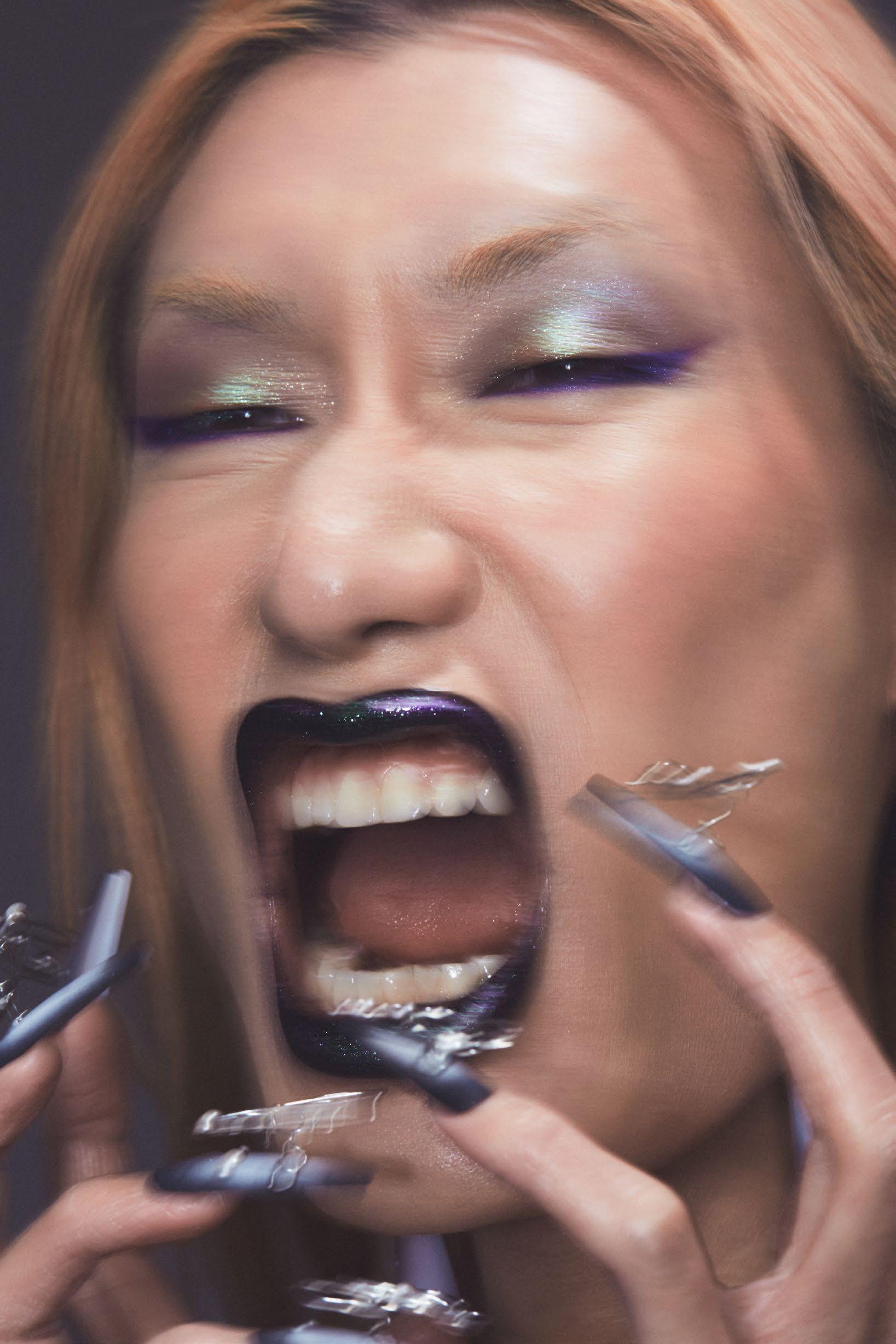 Studded skin is piercing through as seen in shows from Dilara Findikoglu and Balenciaga - with models such as Bella Hadid and Amelia Gray sporting the edgy, overthe-top prosthetics and accessories. Alexis Stone, one of the many talented makeup artists at Balenciaga, explained their mission to “create a collective group of people” and break down divides with the use of overly dramatic makeup and accessories. The striking studded looks perfectly reflect the dark and brooding theme a lot of brands leant towards this season. Elena Velez sent a few of their models out with silver embellishments on their lips, contrasting the rugged, rebellious style of the outfits.