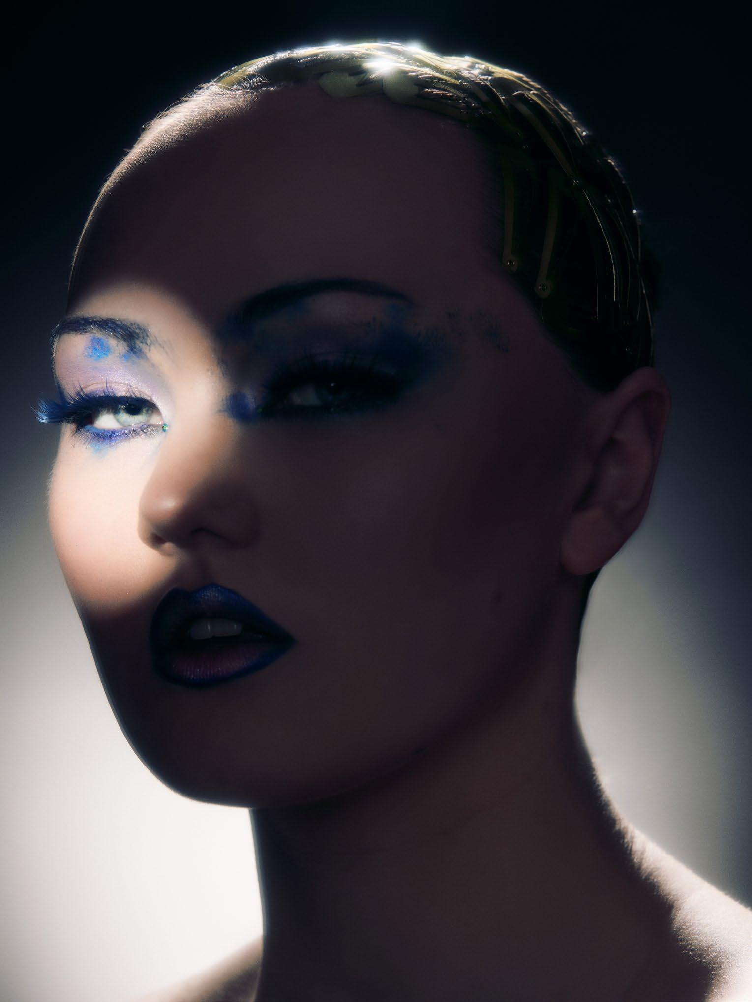 KVD Beauty Good Apple Foundation, £34. MAC Cosmetics Paint Stick, £24. Juvia’s Place Eyeshadow Palette, in Olori 2, £14. Glisten Cosmetics False Lashes, in Indigo Blue, £6. Fenty Beauty Flypencil Eyeliner, £18. About Face Light Lock Lip Gloss, £10. Byredo Colour Stick, in Ultramagnetic, £32. Amazon Blue Gems,