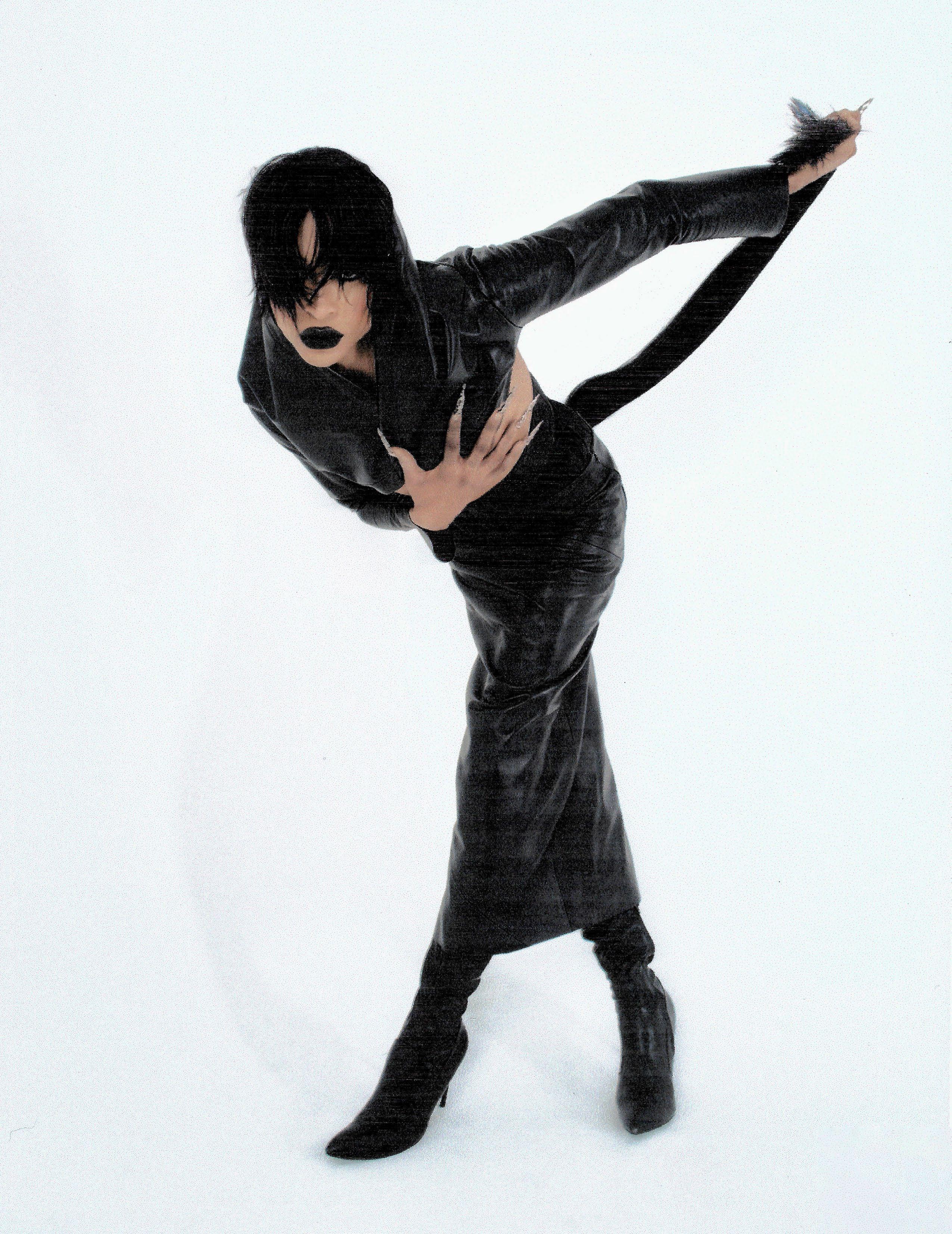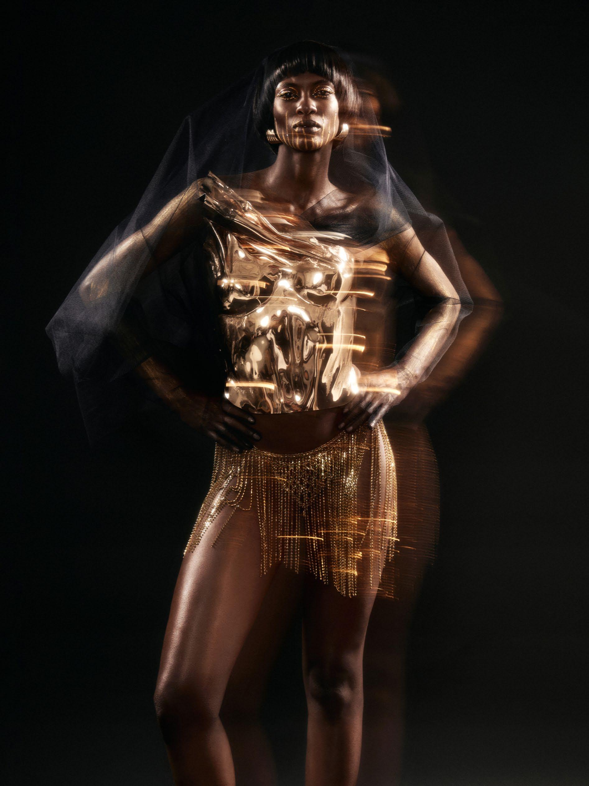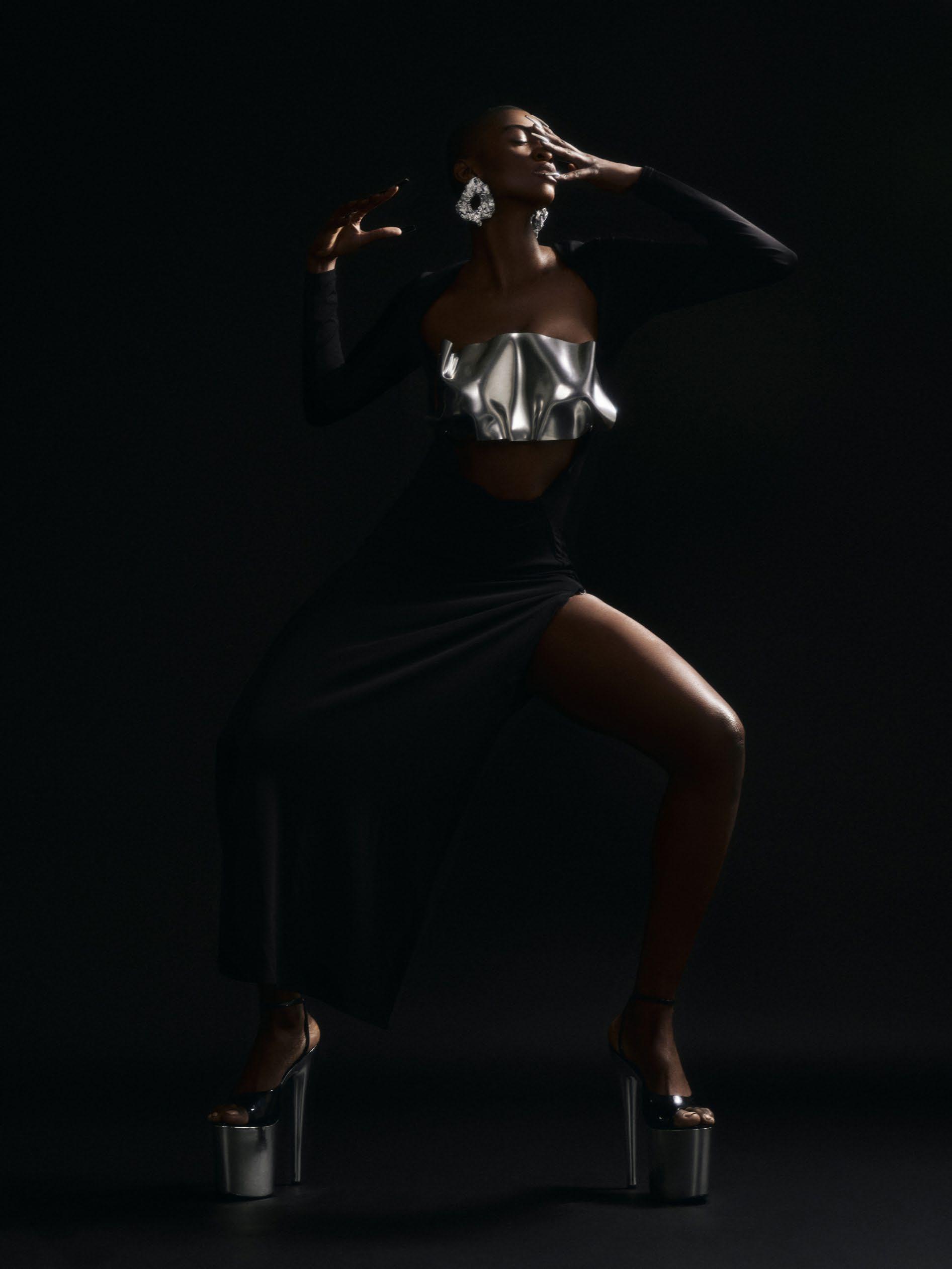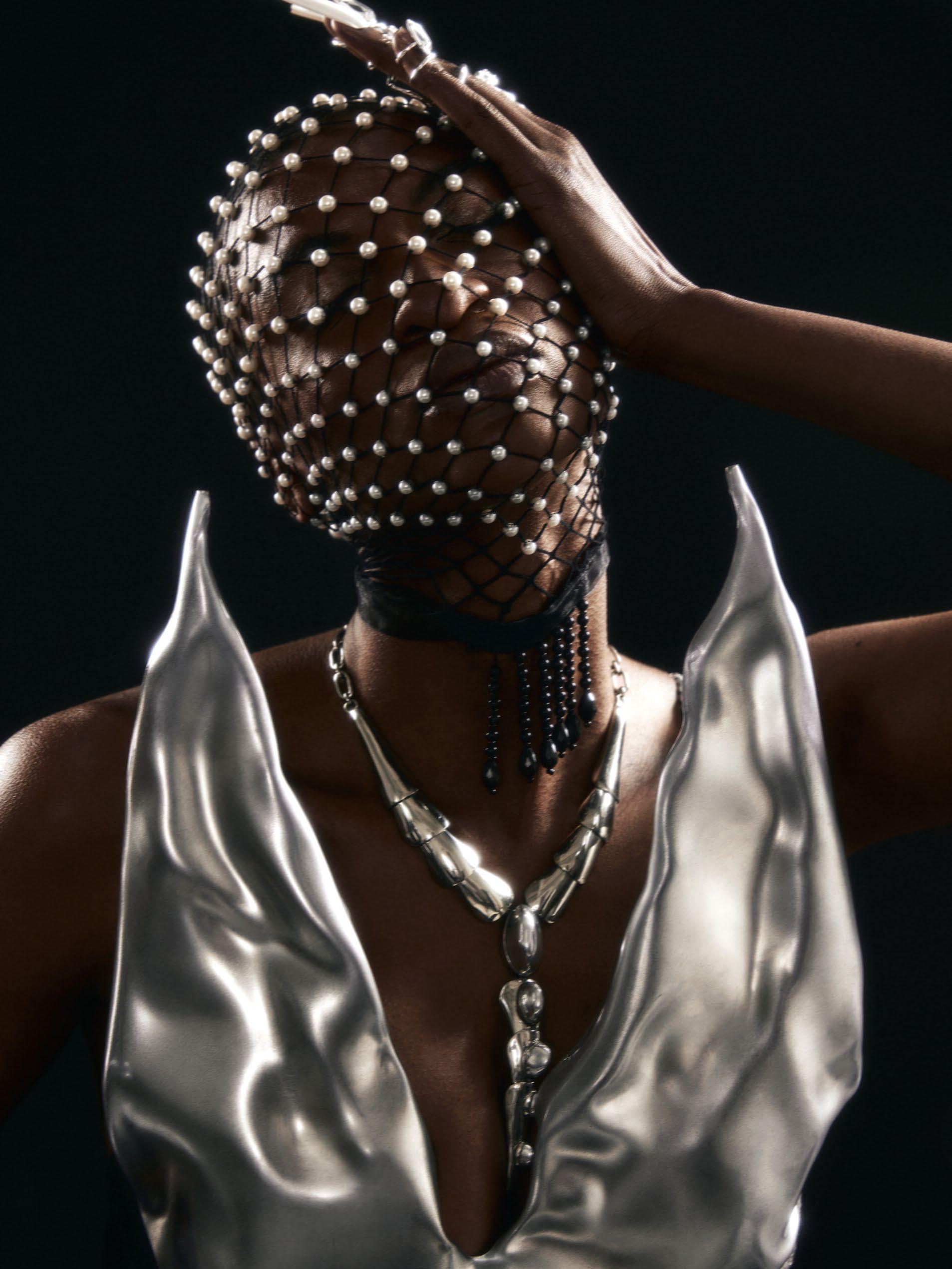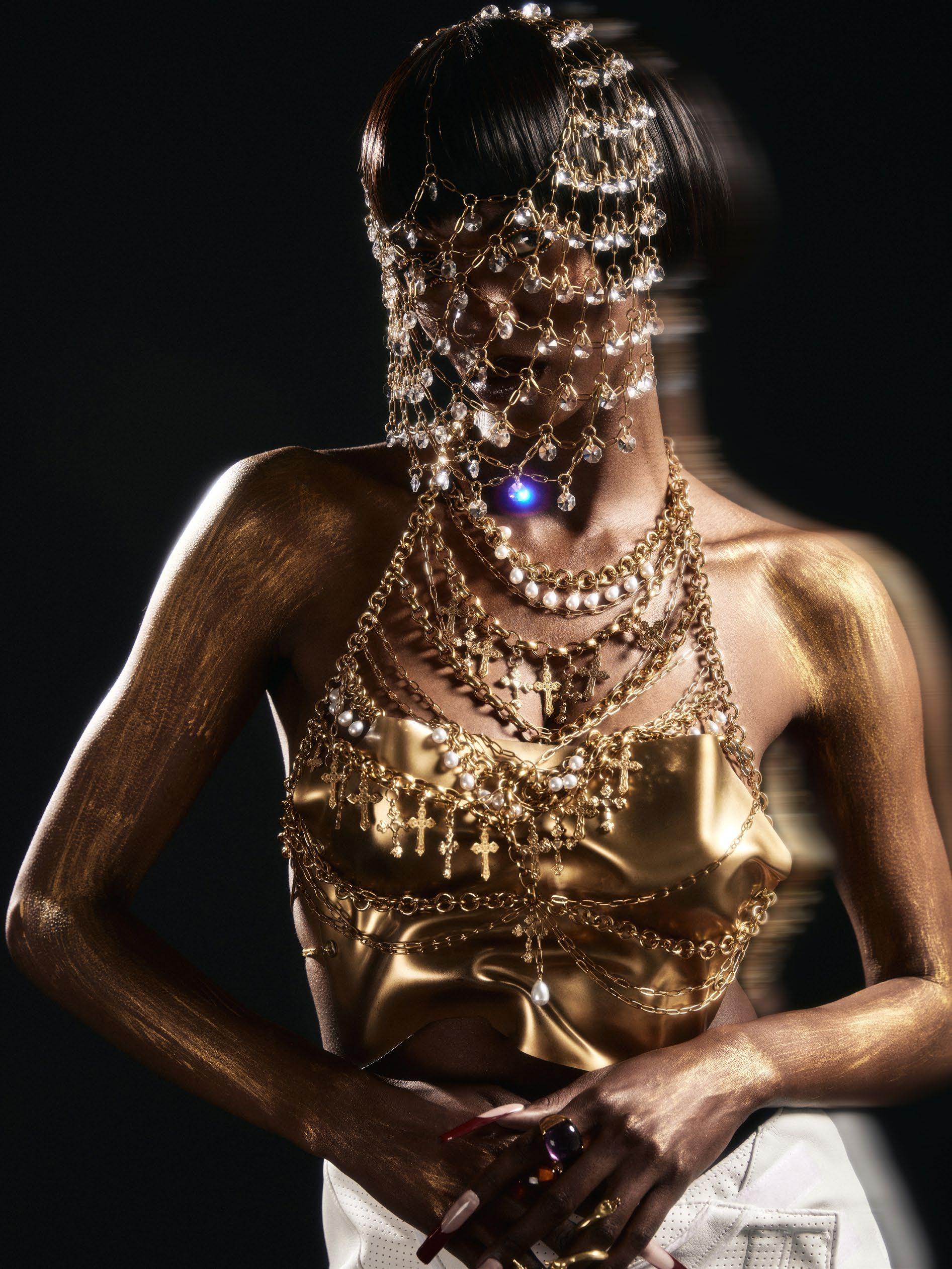 24 Nikita Karizma 90s Vegan Leather and Chainmail Dress in Black & Silver £825. Cameron Hancock Metal Horned Armour Plate £220. Costume Therapy Amardillo Fusion Necklace £203. Rysia Pierzchala Beaded Head Piece £750. René Coavilla Spiral-Design Heeled Sandals Available at Farfetch £1136. Silver Rings Available at H&M Rental £15. Morningstar Nails.