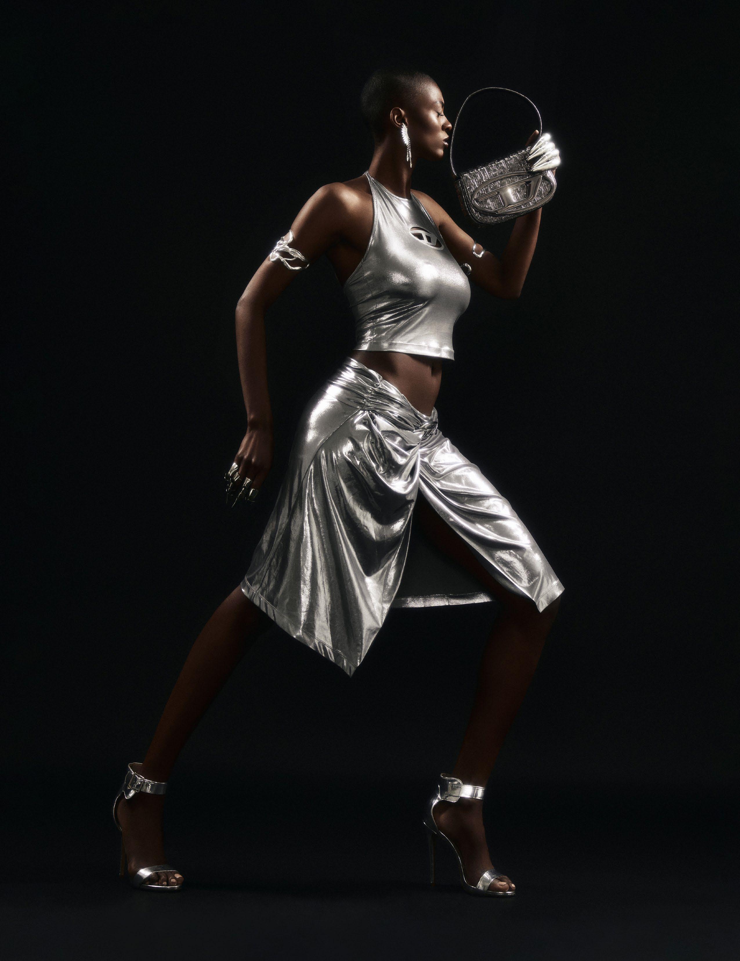 Diesel Pre-Fall 2023 Silver Halter Neck Top, Silver Skirt and Bag POA. Costume Therapy Armadillo Rings £235. Silver Arm Cuff and Silver Rhinestone Earrings Available at H&M Rental £15. Stylist’s Own Shoes. Click To SHOP
