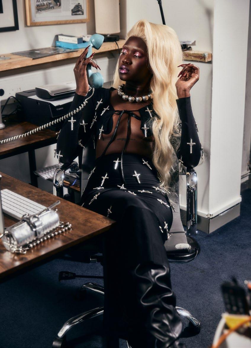 TOP & SKIRT: NAMILIA SS24 “IN LOVING MEMORY OF MY SUGAR DADDY”, JEWELLERY: NECKLACE VANESSA BARONI DESIGN BEADS NECKLACE SILV ER £249.HANDBAG: MINI BARREL BAG SILVER PRIVATE POLICY £285. 45 Click To SHOP