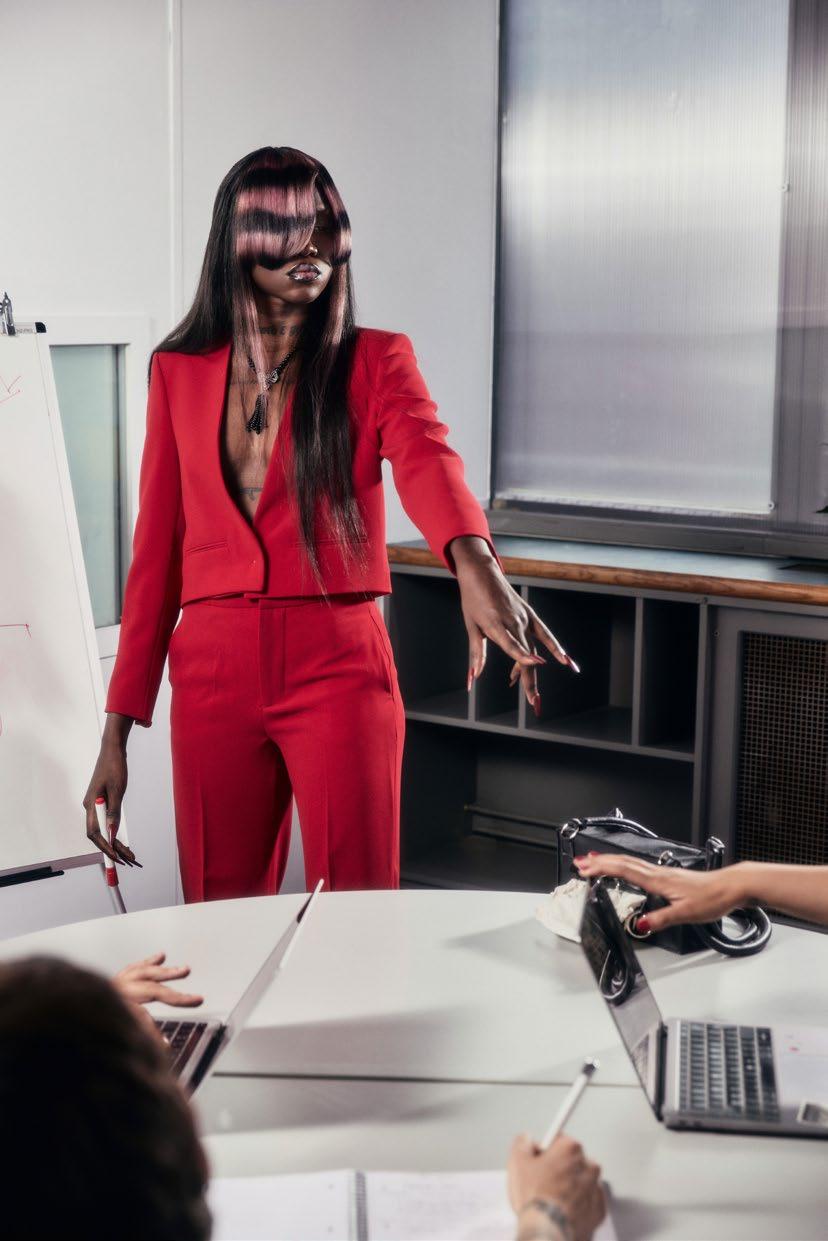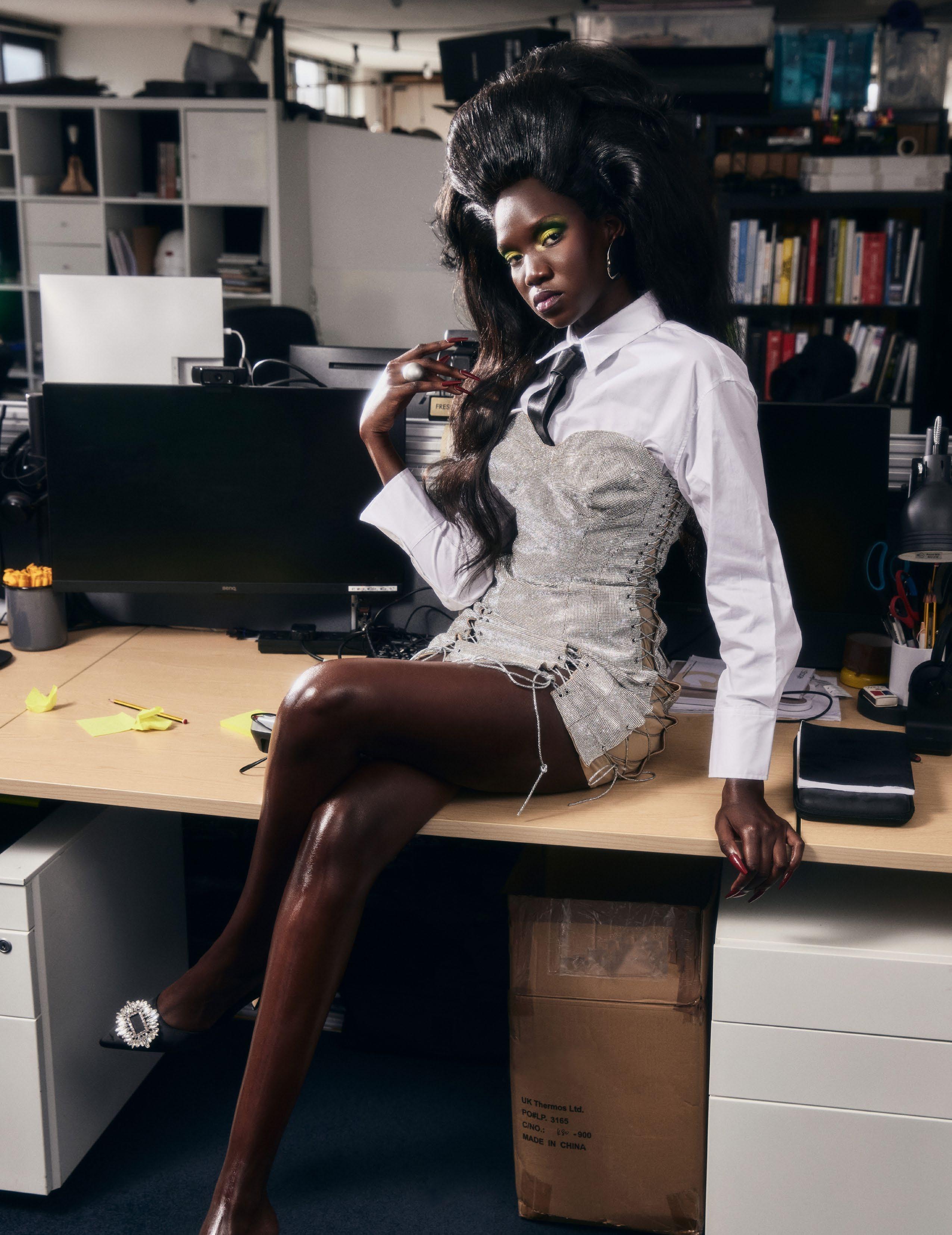 TOP: HUGO BOSS SLIM-FIT BLOUSE IN EASY-IRON POPLIN£99, DRESS : NIKITA KARIZMA CRYSTAL LACE UP DRESS£897, JEWELLERY: POSTER GIRL NUCLEAR EARRINGS IN SILVER£370, TIE: BRIONI ESSENTIAL BLACK TIE£200. Model NYALUAK LETH 39 Click To SHOP