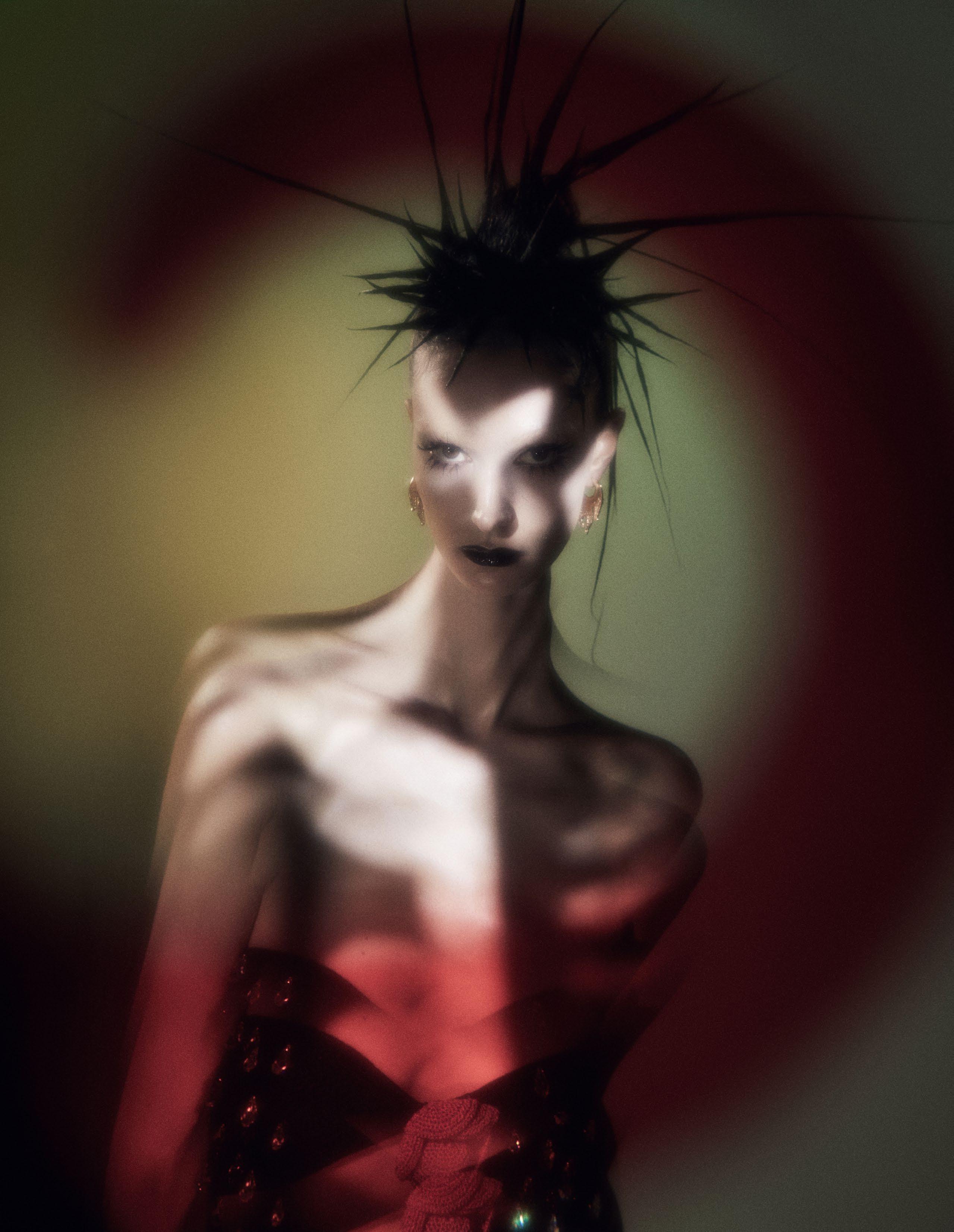 CHRISTIAN DIOR VINTAGE £50 RENTAL, TOP: F ROLOVCORSET CRUSH £655. PREP: WELEDA SKIN FOOD£14.75, LIP S: DANESSA MYRICKS COLOUR FIX IN LPRIMARY RED£20, FOUNDATION : ESTEE LAUDER DOUBLE WEAR£38.50, CONCEALER: ESTEE LAUDER DOUBLE WEA R£28 & KEVYN AUCOIN SKIN ENHANCER IN SX04£32, BRONZER: BE AUTY BAY LIQUID CREAM BLUSH IN BLOOMING£9, BLUSH: PAT MCGRAT H SKIN