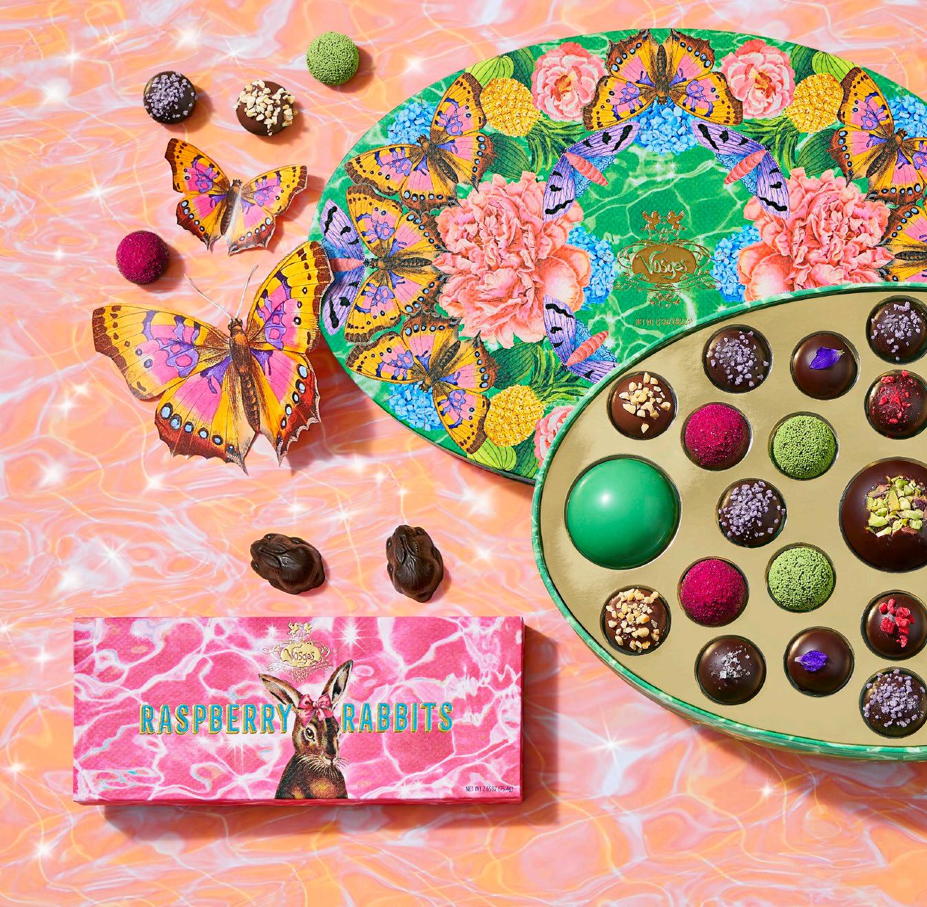 Our newest collection for Spring is presented in a stunning garden design of peonies, dragonflies and butterflies flying over a pool of reflecting water. Our homage this season is to the importance of water that allows the sprouts to begin budding through the dark earth and yield the plants' leaves, fruits and seeds we chose to include in this year’s collection. Taste an arrangement of pandan leaves, Piemonte hazelnuts, rose and orange blossom water, raspberries, Sicilian pistachios, violets and grassfed butter ganache among many more.