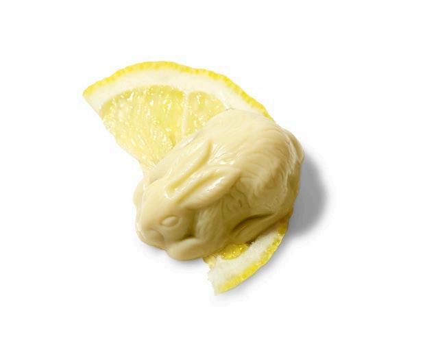Set of seven fresh lemon zest rabbits filled with I.G.P. Piemonte hazelnut ganache encased in 36% cacao white chocolate.