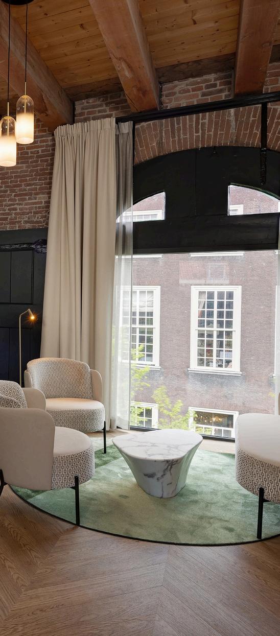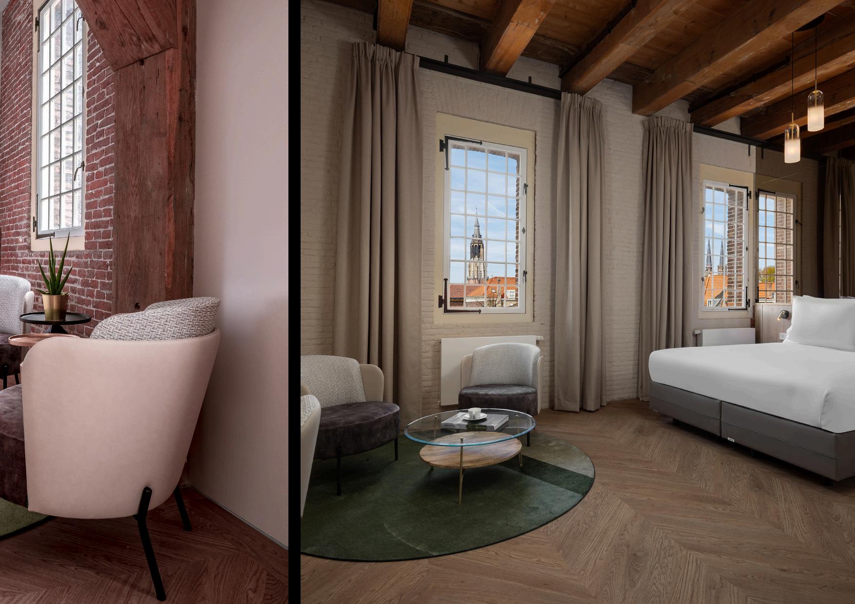 Our suites have a spacious layout of approximately 39 m2 and are completely finished in boutique style. The suites are located in the middle of the building and have a view of the oldest canals of Delft In addition, our suites have many original elements such as large arched windows, original warehouse doors and solid oak beams on the high ceiling