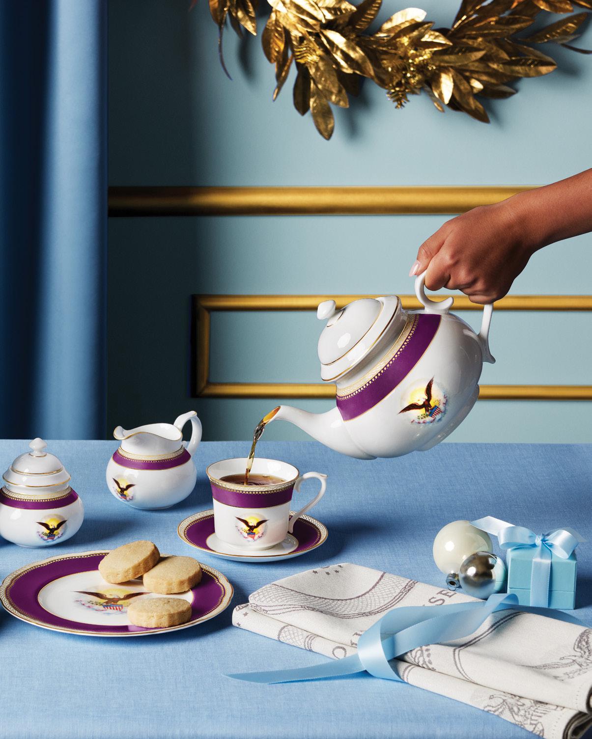 Although teatime might remind you of Buckingham Palace and the streets of London, this tea set is reminiscent of highly recognized and revered dinnerware from American presidential history. Upon finding the lack of suitable china, First Lady Mary Lincoln ordered a new set for the White House, where welcoming prominent political leaders was a crucial part of diplomacy. These elegant, English Fine Bone china pieces are handcrafted, and hand decorated with gold accents to perfectly mirror the beloved tea set of President Abraham Lincoln.