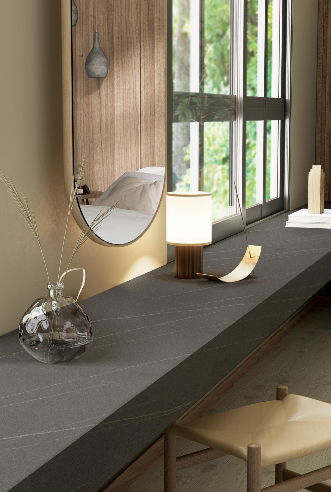 Carbone Marmo captures the aesthetic of soapstone with a charcoal grey background that features subtle particulates, soft vertical veins, and silvermetallic dust. Soapstone has a rich history as an architectural and artistic marvel — and in modern interiors, it lends a warm, inviting look for a wide variety of décor styles.