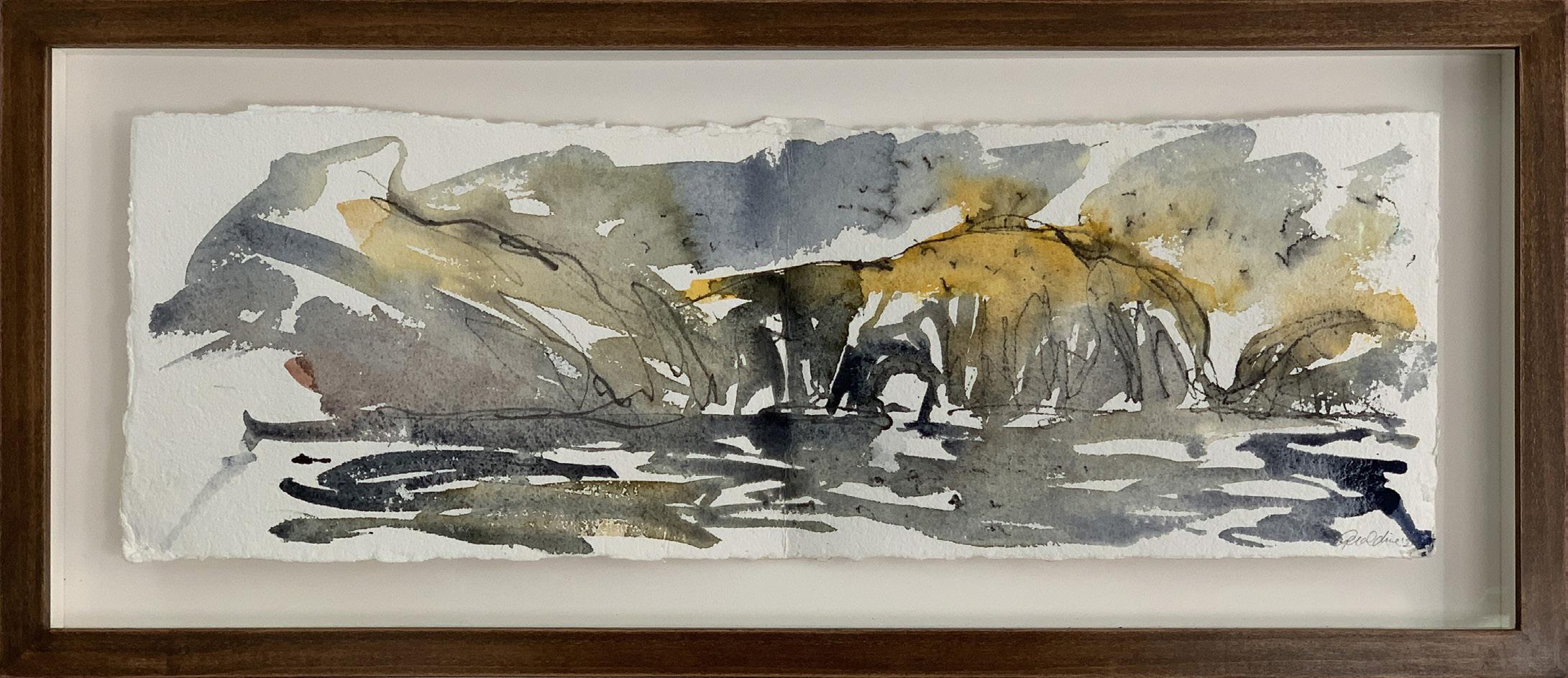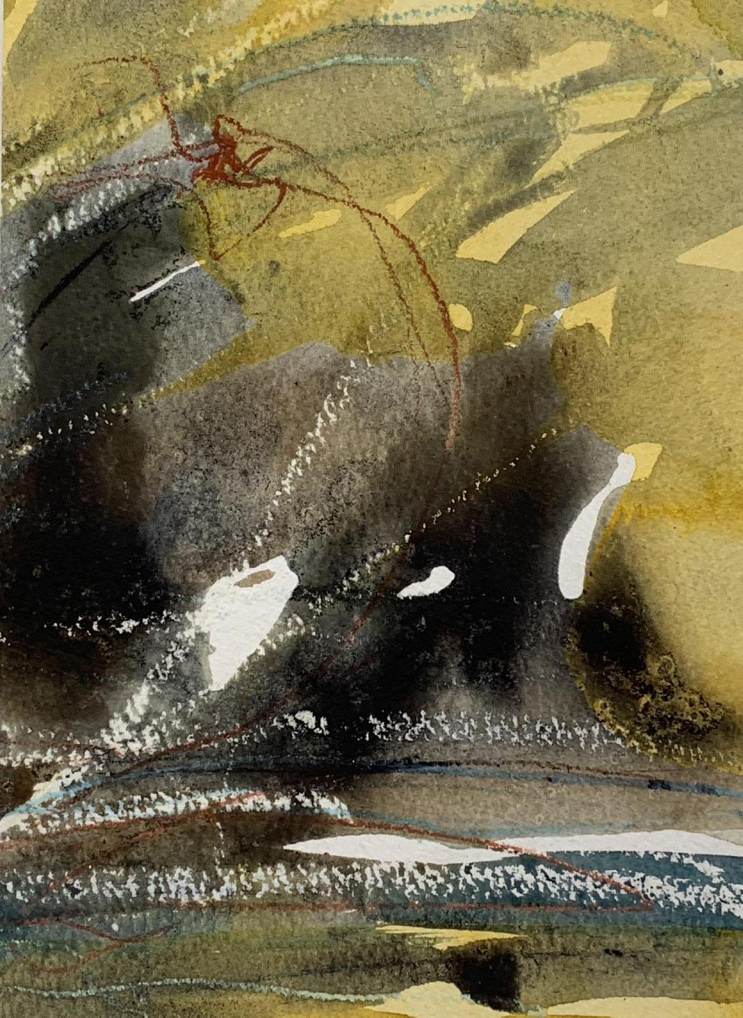 Van Heemstra – a walking artist who experiences her landscapes on the move - urges us out and into this lost world of wind, rain, storms. ‘I don’t like still, summery days with blue skies,’ she tells me. ‘Those are not the days when I feel truly alive’. Instead, the ideas and images that seeded this exhibition came as she walked with her sketchpad, paints, palette, pens and pencils, into the most remote corners of Scotland, in the most dramatic of weathers.