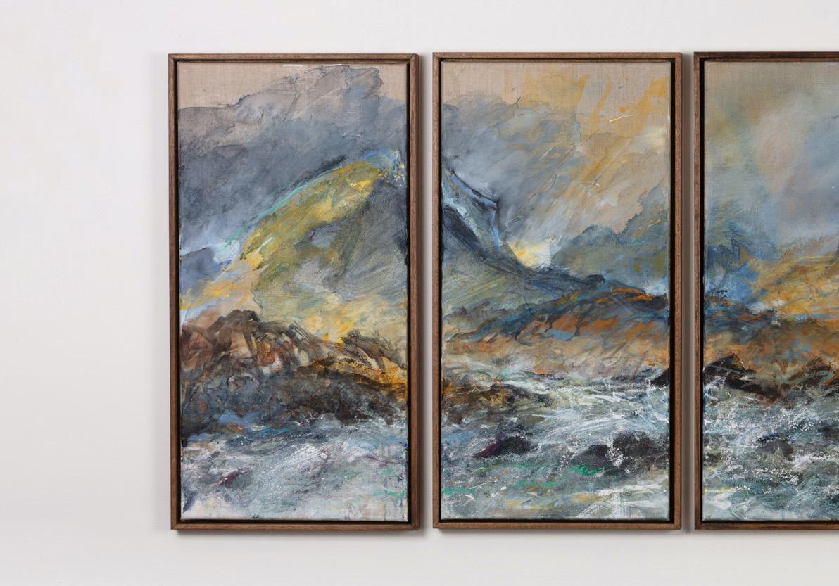 In her work there are shades of Turner and Norman Ackroyd, with a nod to the Dutch masters she studied 30 years ago, as a student and then as a fine art restorer. But, above all, van Heemstra brings to mind the dazzle and courage of Joan Eardley who famously painted the North East Scottish coast in all weathers, roping her easel and canvases to trees and buildings, amid tempestuous winds and fierce rains. Like Eardley, van Heemstra powerfully captures the brooding skies pronged with light, the ferocity of falling water, the wind-buffeted alchemy and the electric energy, of remote Scotland. Like Eardley, she grapples with how to understand (not merely record) a landscape. But van Heemstra also brings a quiet order to her work, so that rather than feeling intimidated or frightened we feel emboldened: we too can connect with this vanishing world and we too can find the pulse and soul of a place.