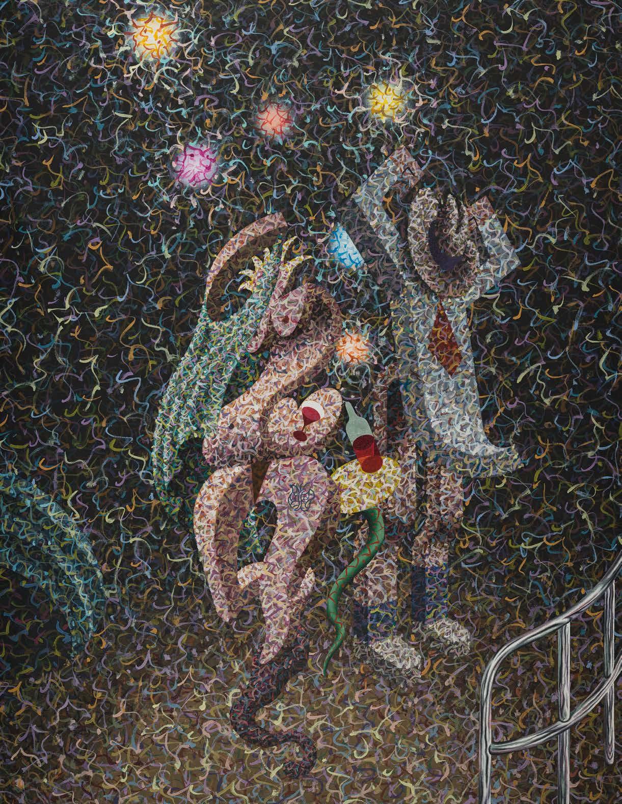 Orlik captures the joie de vivre of two ‘winos’ with humour and camaraderie. They appear to float in their drunkenness, clothes rising as wine bottle and glass tip over. Fireworks burst overhead, echoing their ebullience. The woman kicks up her legs in dance, revealing a butterfly tattoo, her spiky blonde hair resembling the Statue of Liberty’s crown. A snake-like table leg symbolizes temptation fully embraced.