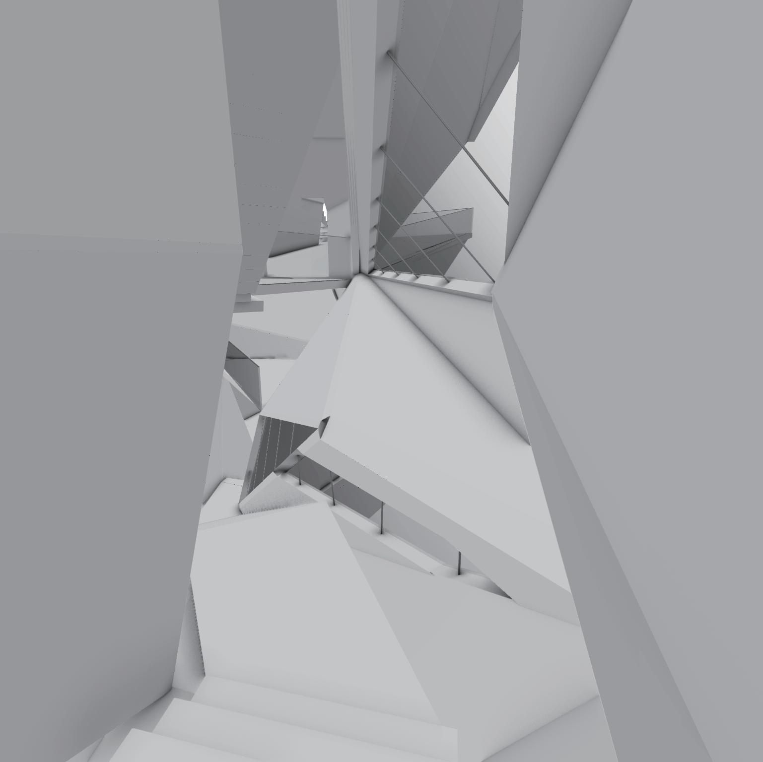 量體的形變。運用投影幾何的方式,將原先量體與移動的點進行投影,翻轉後進行二次投影,用這樣的方式來去探討其他的5個點 所能產生的形變,速度越快,量體就會形變得越多,而因為有翻轉並再投影的方式,有些量體將不具備水平的樓板。 將原先美術館的program拆解為各個行動後,依照行動的快慢分類,並將其依照對應 的速度重新組構,同一個速度的行為將會被放置在同一個空間。