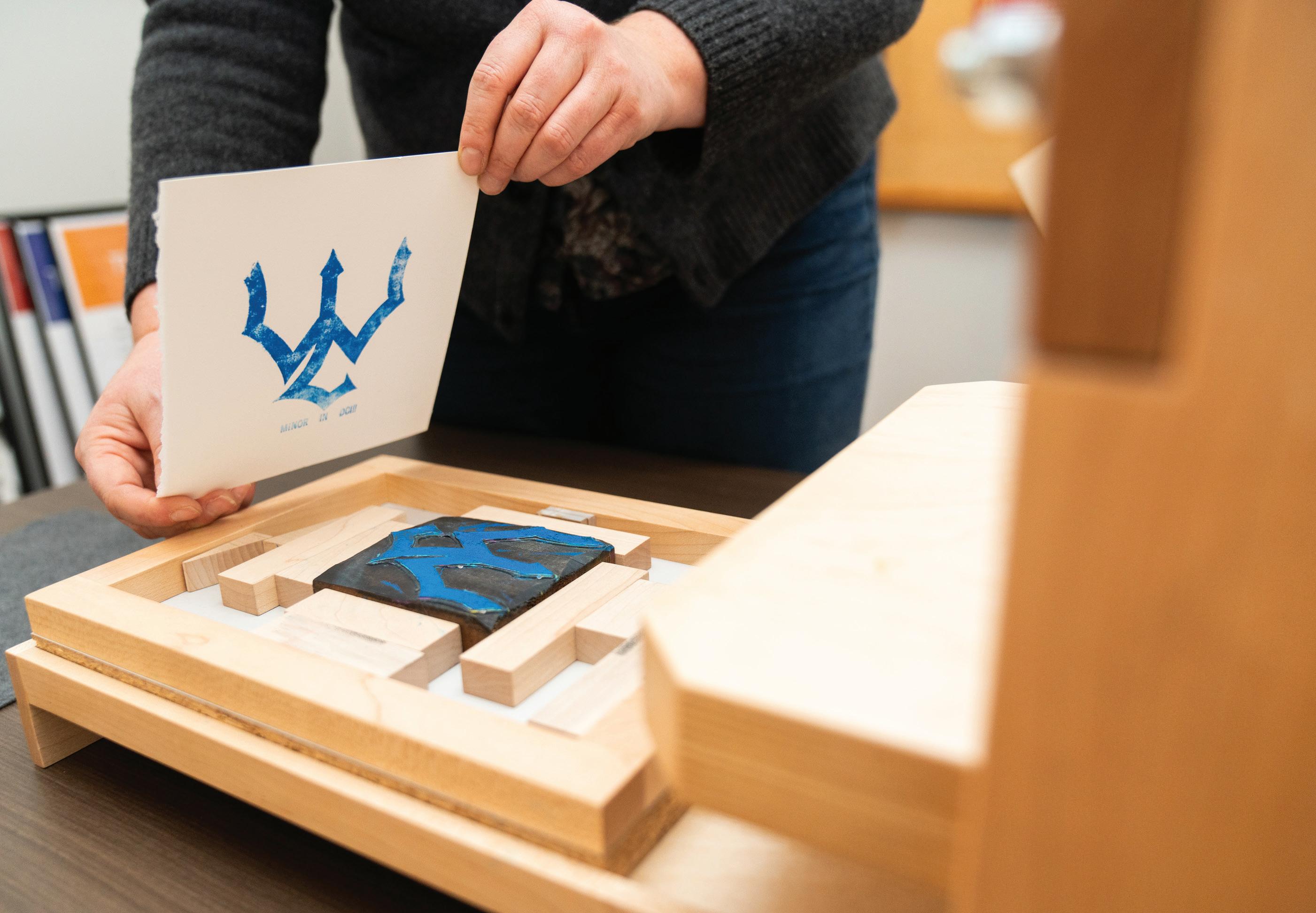 Mackenzie Brooks, associate professor and digital humanities librarian, has been mentoring Holly Pickett, professor of English, on how to use the letterpress as part of a Harte Center Fellowship. The program encourages faculty to explore a learning opportunity outside their expertise and share how the experience relates to their teaching.