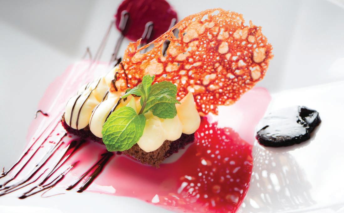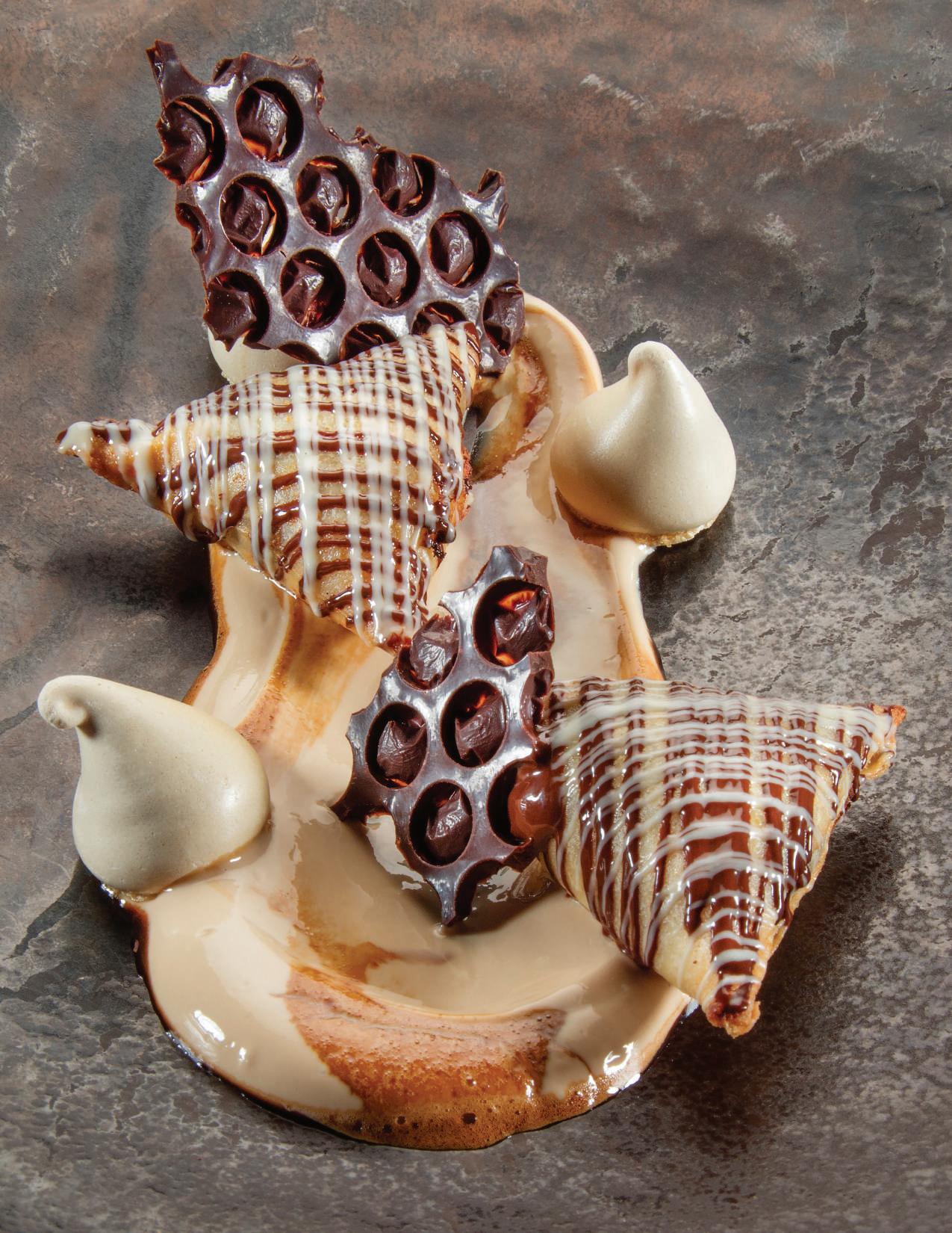 Place a “lingotto” of mascarpone-flavoured Bavarian cream, cocoa biscuit and coffee cream, previously obtained with the help of acetate paper and dusted with cocoa powder, in the centre of the plate. Create, with the pastry bag, three points of coffee cream alternating with three points of mascarpone-flavoured Bavarian cream. Finish the dish with the cocoa crumble and three coffee meringues.