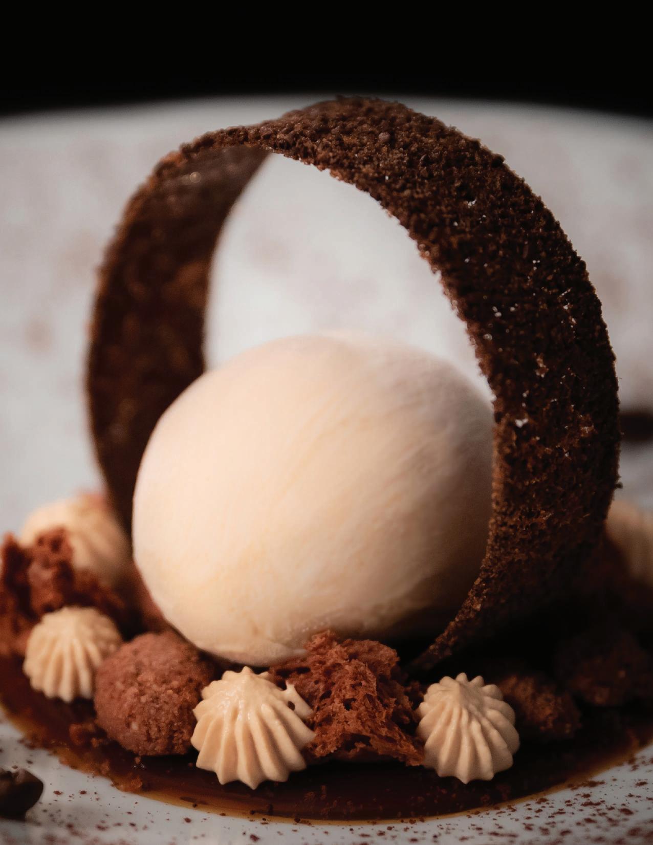 Put some coffee custard on the base of the plate, sprinkle with sugar and burn with a torch to caramelise the surface. In the centre of the plate put a rectangle of cocoa and coffee cake, an ice cream ball on top of the cake, decorate with a tulip and with a few grains of chocolate and coffee.