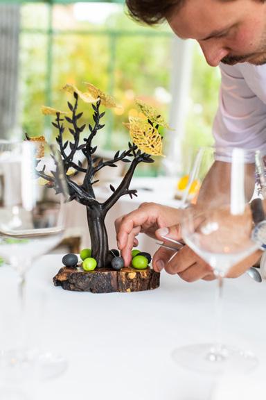 The Michelin-starred restaurant is committed to a locavore approach that favors fresh organic produce and herbs grown on the estate, as well as enduring relationships with local farmers and breeders. This spirit is expressed right down to the locally handmade plates, and the knives, crafted in the nearby town of Draguignan.