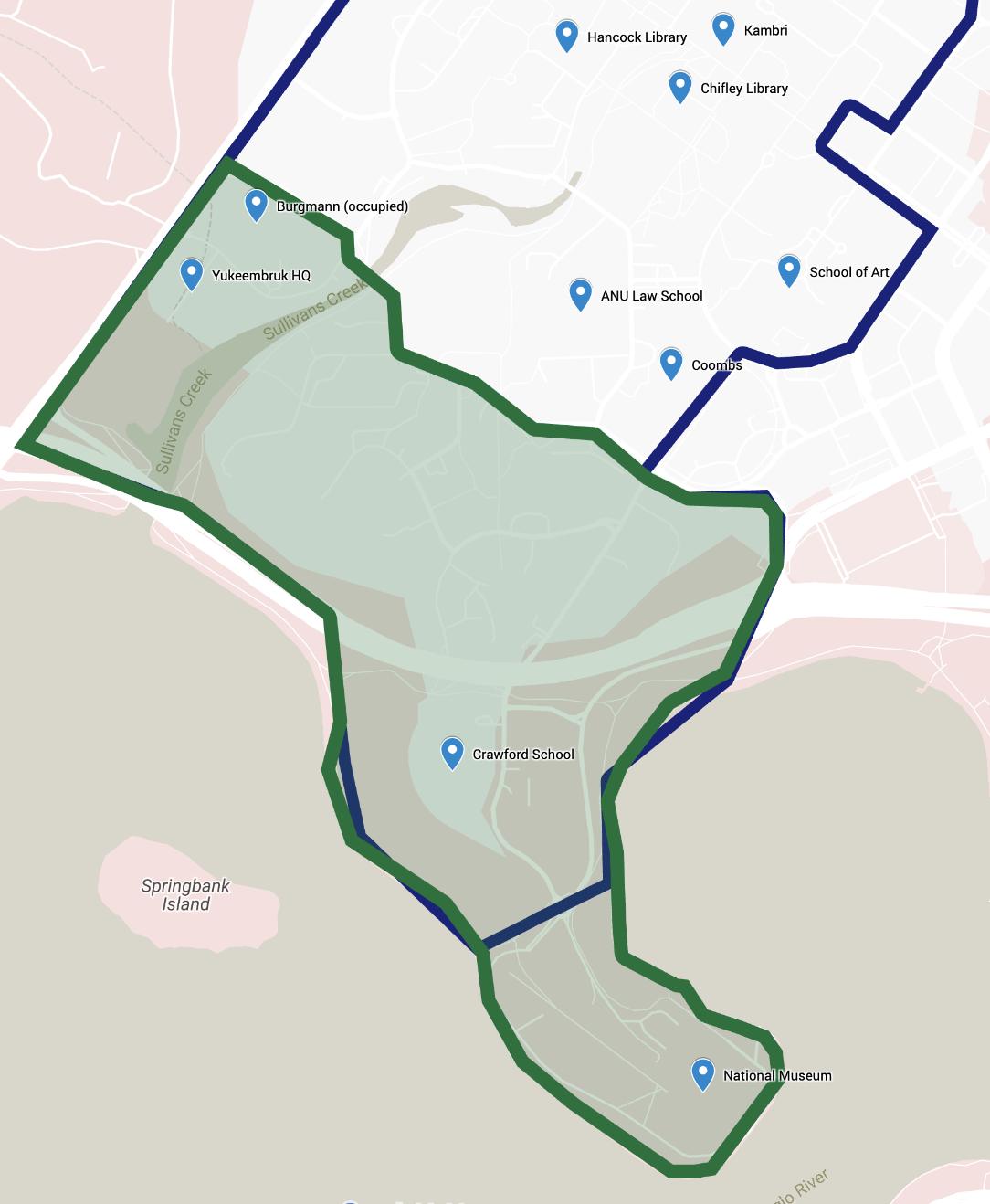 Area outlined in blue is the ANU campus. Area shaded in green is the area currently claimed by the YKB-aligned separatists