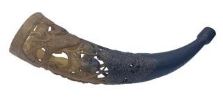 Dan Super DS-75: Dark carved blowing horn (hunting scene), c. 1915 Carved Horn 10 x 2.50 in Dan Super DS-76: Blond carved blowing horn with Masonic designs, c. 1920 Carved Horn 11.50 x 4 in Dan Super DS-77: Carved and pierced horn sculpture with nude women in tree, on wood base with star, c. 1915 Carved Horn on wood base 14 x 7 in